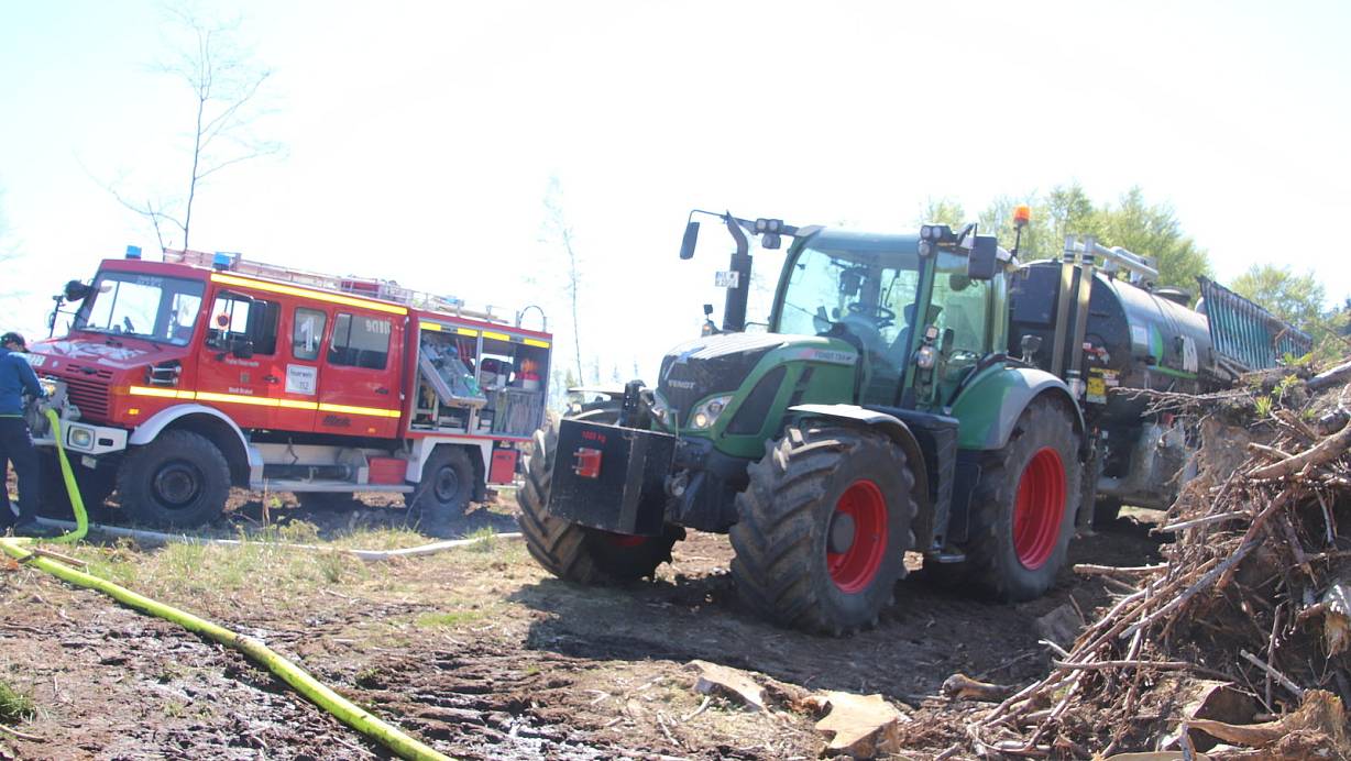 Schweres Gerät für zarte Pflänzchen: Lohnunternehmer und Brakeler Feuerwehr sorgen für den Wassernachschub für die neuen Kulturen. | © Alexander Graßhoff
