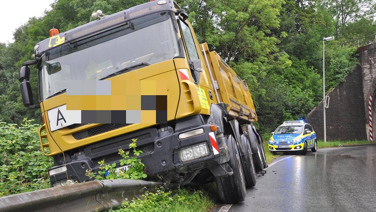 Der 40-jährige Lastwagenfahrer versuchte, auszuweichen, rutschte dabei mit seinem Fahrzeug rechts in den Graben und auf die Leitplanke. Personen wurden nicht verletzt. An den Fahrzeugen entstand nach ersten Schätzungen ein Sachschaden von etwa 4.000 Euro. Um den Lkw bergen zu können, musste dessen Ladung vor Ort umgeladen werden. Dabei kam es zu Behinderungen im Straßenverkehr.