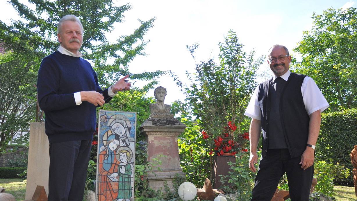 Pfarrer Willi Koch - hier mit einem Fensterbild von der heiligen Mutter Anna - heißt seinen künftigen Nachfolger Monsignore Andreas Kurte in Brakel willkommen. | © Helga Krooß