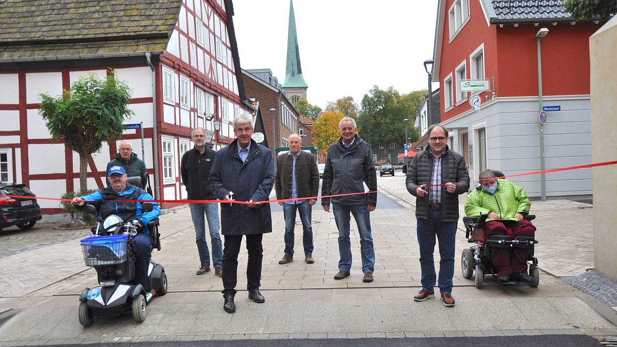 Karl-Josef Günther (von links), Bauamtsleiter Johannes Groppe, Dirk Ihmor, Bürgermeister Hermann Temme, Georg Tegetmeier, Robert Rissing, Rainer Schäfers und Corina Muarwski geben den „Thy" für den Autoverkehr wieder frei. | © Helga Krooß