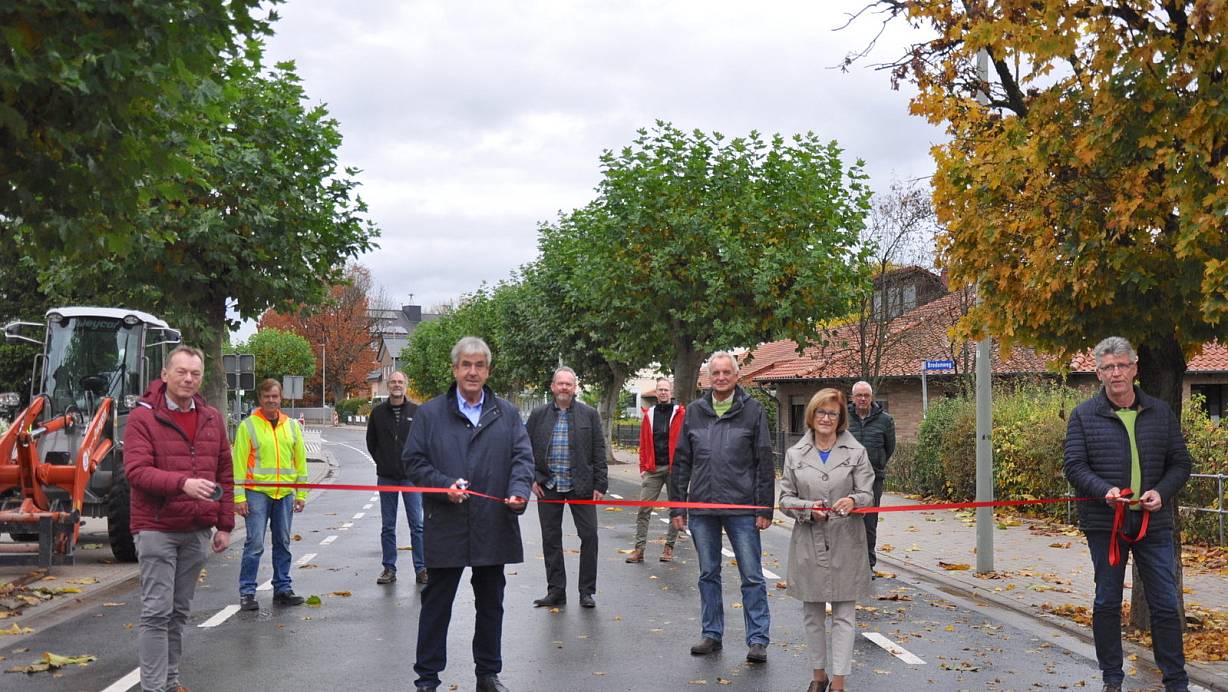 Jochen Bracht, Tief- und Straßenbau Bracht (vorn, v. l.), Bürgermeister Hermann Temme, seine Stellvertreter Robert Rissing und Ursula Grewe sowie Fachbereichsleiter Franz-Josef Sentler geben gemeinsam mit Axel Thöne, Firma Bracht, Dirk Ihmor und Michael Turk, beide Ingenieurbüro Turk, Alexander Frewer, Wasser- und Abwasserwerk, und Fachbereichsleiter Johannes Groppe die Nieheimer Straße für den Autoverkehr frei. | © Helga Krooß