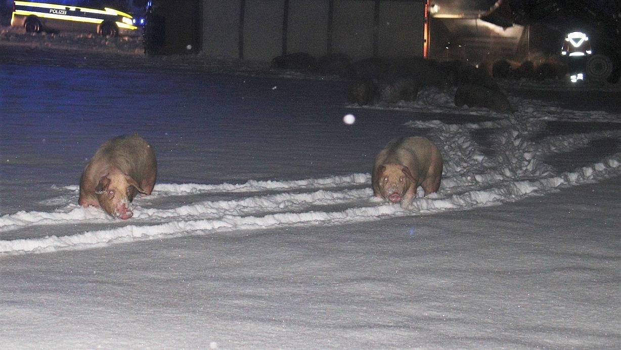 15 Schweine kamen bei dem Unfall ums Leben. Viele weitere liefen unkontrolliert im Schnee herum. | © Polizei