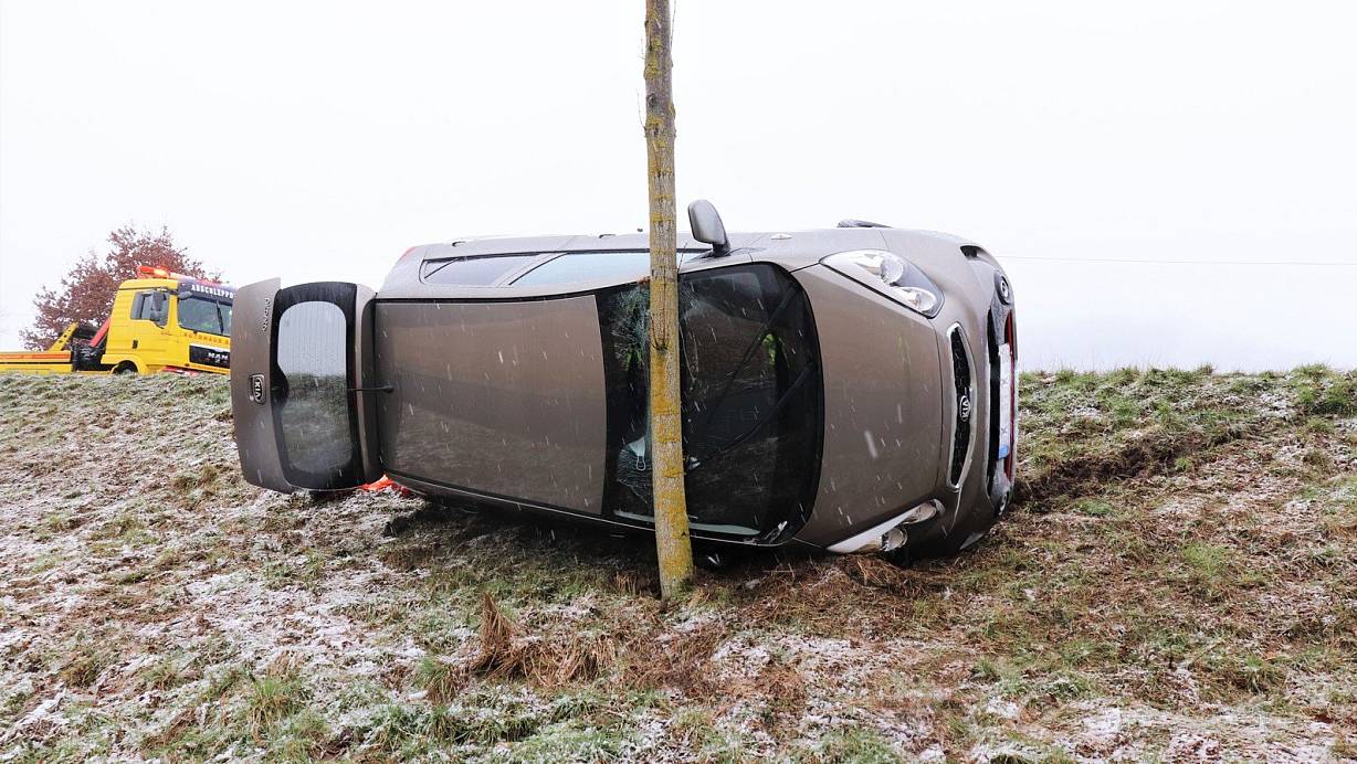 Gegen 12.15 Uhr war eine 48-Jährige in ihrem Kia Picanto aus Richtung Nieheim kommend auf der Ostwestfalenstraße (B 252) in Richtung Brakel unterwegs, wie die Polizei mitteilt. Die Fahrbahn war aufgrund Schneeregen feucht. Nach Passieren der Gebetsstätte "Mutter Gottes im Wasser" geriet das Auto auf gerade Strecke aus bislang unbekannter Ursache nach rechts auf die Bankette und wurde von dort wieder nach links auf die Fahrbahn gesteuert. Der Wagen driftete über beide Fahrstreifen in den gegenüberliegenden Graben. Dort kam der Wagen, auf der Beifahrerseite liegend, vor einem Baum zum Stillstand.