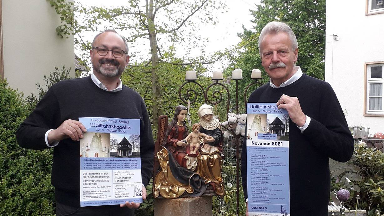 Die Statue zeigt die drei Protagonisten, um die sich der Brakeler Annentag dreht. Und auch die Annennovenen, die wieder mit Gläubigen gefeiert werden können. Darüber freuen sich der neue Pfarrer Andreas Kurte (l.) und sein Vorgänger Wilhelm Koch. | © Manuela Puls