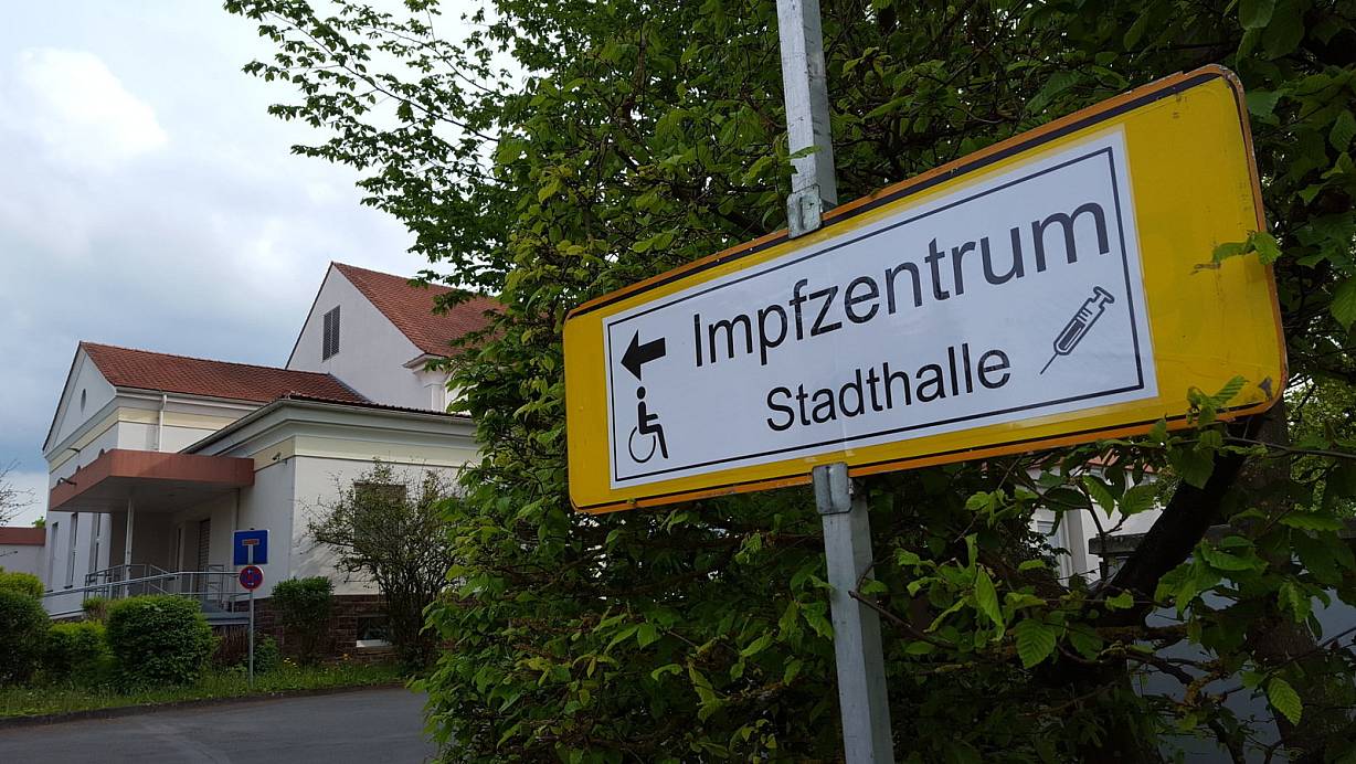 Ein Hinweisschild weist den Weg zum Impfzentrum des Kreises Höxter in der Stadthalle Brakel. Jetzt muss es wegen Impfstoffmangel zeitweise schließen. | © David Schellenberg