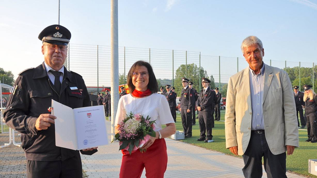 Abschied nehmen hieß es für den stellvertretenden Leiter der Freiwilligen Feuerwehr der Stadt Brakel, Karl Breker (links), der von Bürgermeister Hermann Temme die Entlassungsurkunde erhielt. Ehefrau Birgit Breker bekam einen Blumenstrauß. | © Helga Krooß