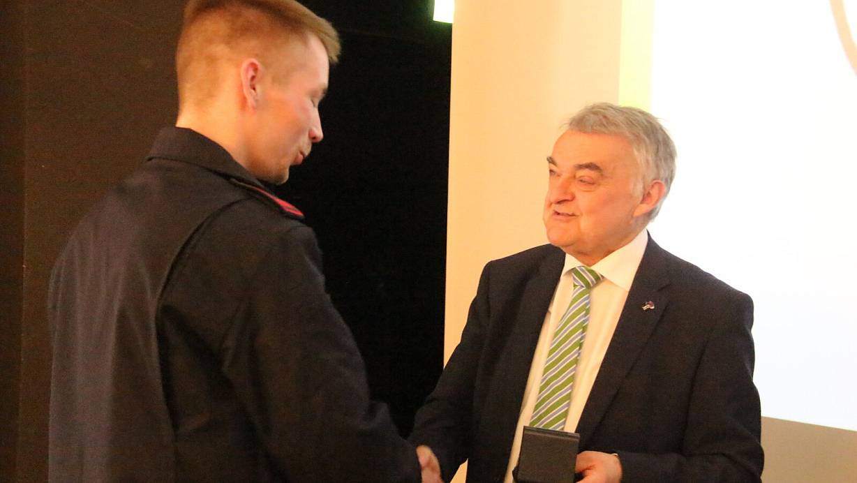 Herbert Reul besteht bei einem Festakt darauf, allen 300 Einsatzkräften des Kreises Höxter persönlich die Hand zu schütteln. Das bringt den Kreis ordentlich ins Schwitzen.