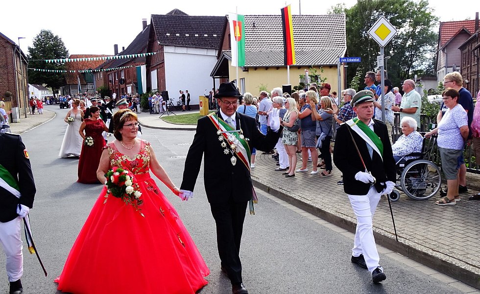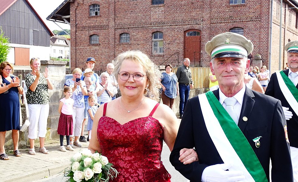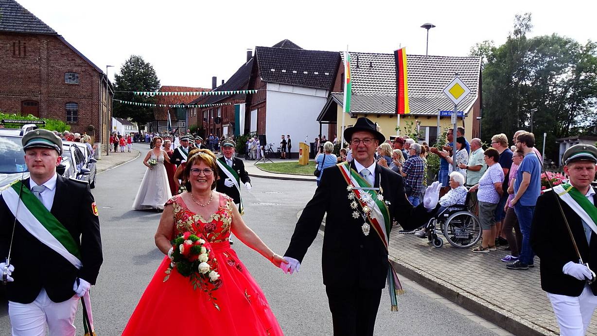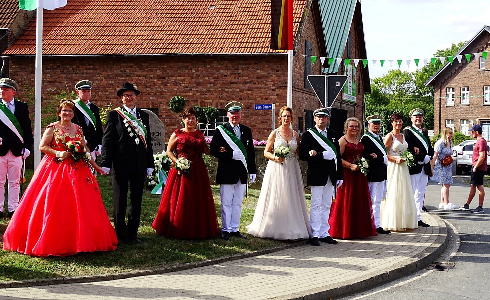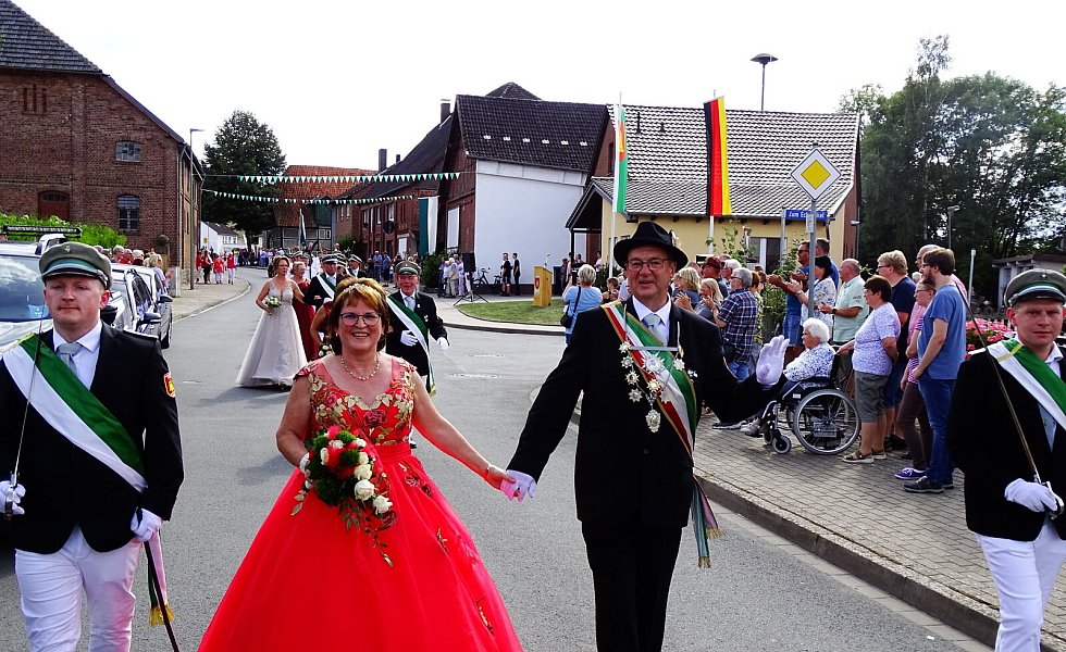 Brakel-Beller. Das beschauliche Nethedorf Beller feiert ein ausgelassenes Schützenfest zu Ehren von König Helmut Weinreich und seiner Königin Elisabeth. Die Regentin präsentierte sich in einem korallfarbenen Kleid, das mit filigranen goldenen Blättern und roten Rosen verziert war. Die Hofdamen - Birgit mit Otto Groppe, Margot Stamm-Beineke mit Karl Beineke, Monika Becker mit Franz Groppe sowie Nicole mit Karsten Happe - trugen bordeauxrote und champagnerfarbene Roben.