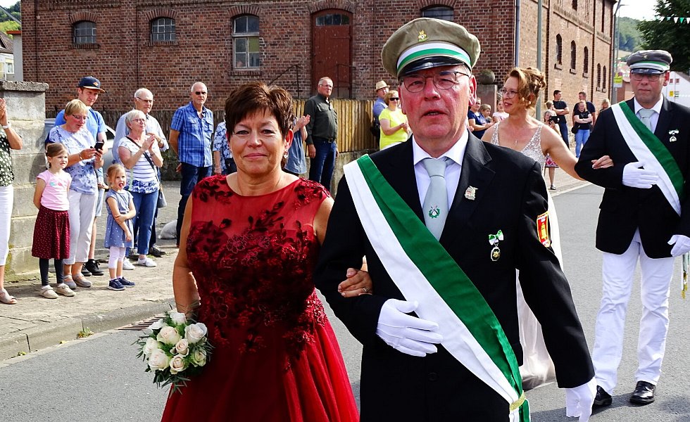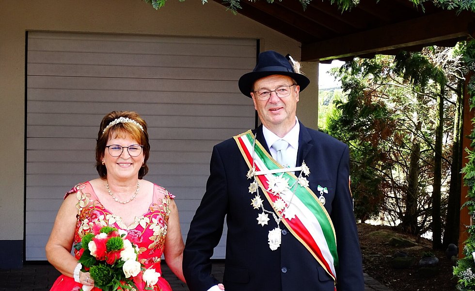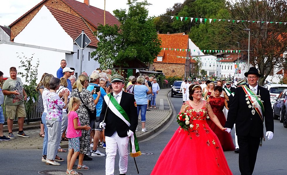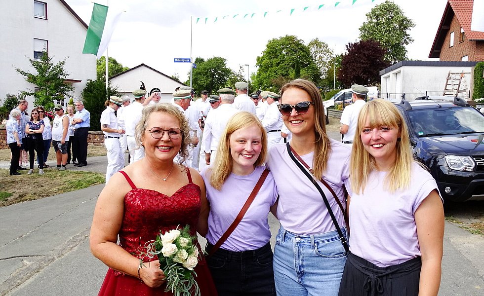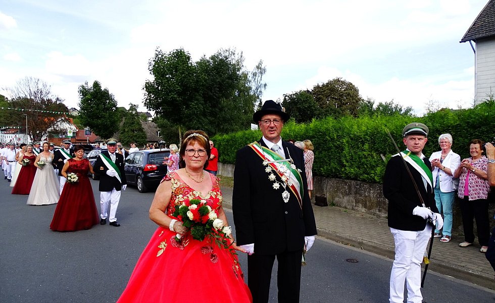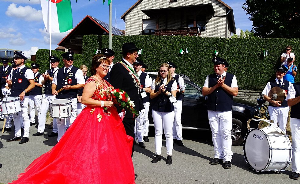 Brakel-Beller. Das beschauliche Nethedorf Beller feiert ein ausgelassenes Schützenfest zu Ehren von König Helmut Weinreich und seiner Königin Elisabeth. Die Regentin präsentierte sich in einem korallfarbenen Kleid, das mit filigranen goldenen Blättern und roten Rosen verziert war. Die Hofdamen - Birgit mit Otto Groppe, Margot Stamm-Beineke mit Karl Beineke, Monika Becker mit Franz Groppe sowie Nicole mit Karsten Happe - trugen bordeauxrote und champagnerfarbene Roben.