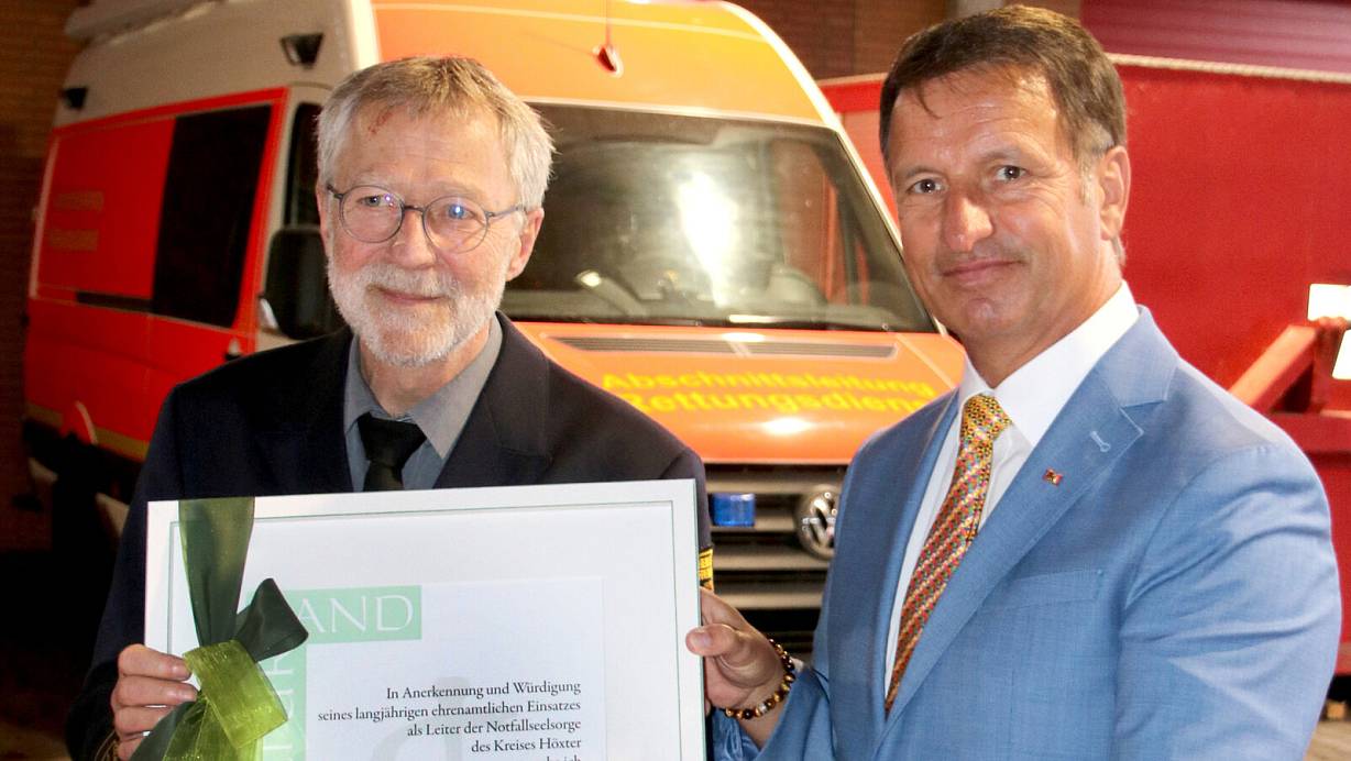 „Als Initiator ist es maßgeblich Ihr Verdienst, dass die Feuerwehr- und Notfallseelsorge im Kreis Höxter heute so gut aufgestellt ist. Sie waren dabei ein Mann der ersten Stunde und selbst Feuerwehrmann mit ganzem Herzen“, richtete der Landrat das Wort an Pater Wunram. „Dafür spreche ich ihnen mit sehr großer Freude den Dank und die Anerkennung der Bürger des Kreises Höxter aus. Ihr Lebenswerk steht im Herzen der Menschen hier.“