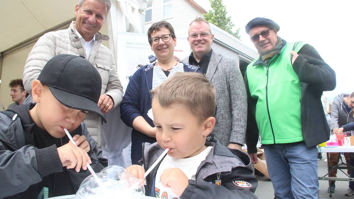 Landrat Michael Stickeln, Pädagogin Melanie Hecker, Werbering-Vorstand Bernhard Fischer und die stellvertretende Brakeler Bürgermeisterin Ursula Grewe eröffnen mit den Nachwuchsforschern Lukas (6) und Mert (4) das Forscherfest. | © Burkhard Battran