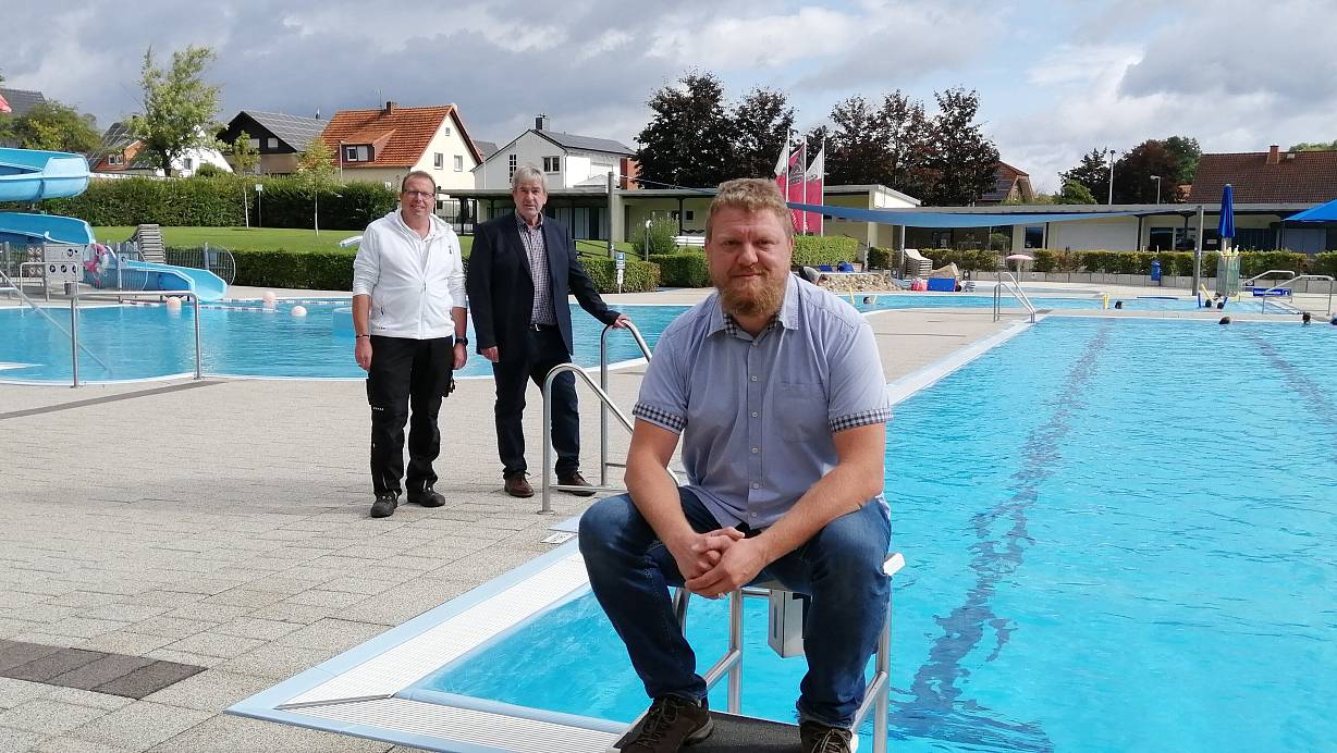 Klimaschutzmanager Thomas Greger mit Schwimmmeister Bernd Willeke und Bürgermeister Hermann Temme freut sich über die erfolgreich umgesetzten Klimaschutzinvestitionen. | © Burkhard Battran