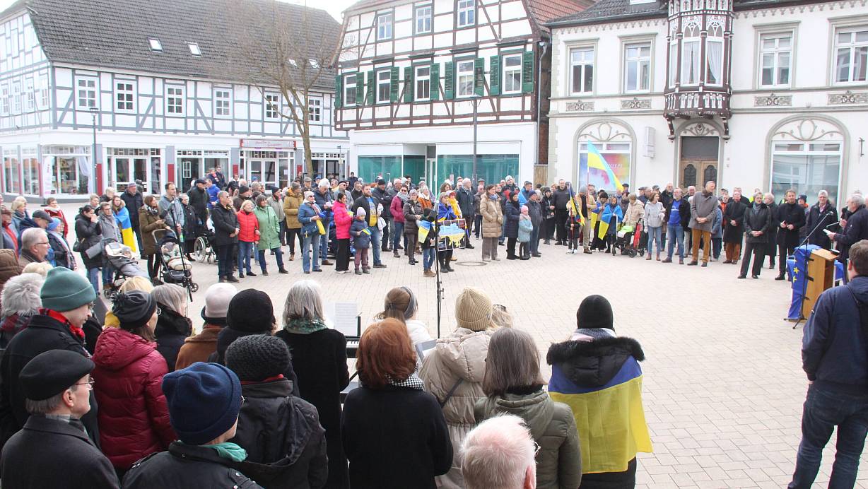 Mehr als 250 Menschen kommen auf dem Marktplatz in Brakel zusammen, um ihre Solidarität mit der Ukraine zu demonstrieren.