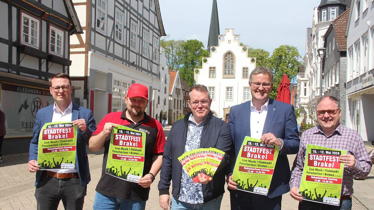 Brakels Allgemeiner Vertreter Alexaner Kleinschmidt (v. l.), Werbering-Vorstand Markus Härmens und Bernhard Fischer sowie Sponsorvertreter Dominik Reineke und Werberingvorsitzender Rainer Schäfers freuen sich schon auf das diesjährige Brakeler Frühlings-Stadtfest. | © Burkhard Battran