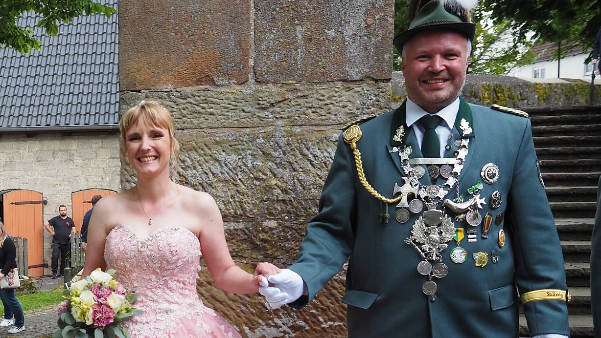 Mit Sang und Klang durch das grüne Dorf: Die Majestäten Sebastian und Annica Schmitz stehen im Mittelpunkt.