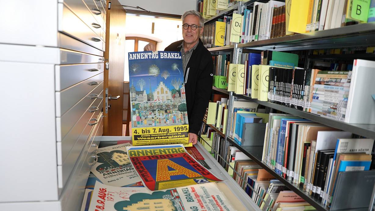 Stadtarchivar und Museumsleiter Dirk Brassel zeigt die Plakate vom Annentag aus den 70er-, 80er- und 90er-Jahren, die im Stadtarchiv lagern. | © Simone Flörke