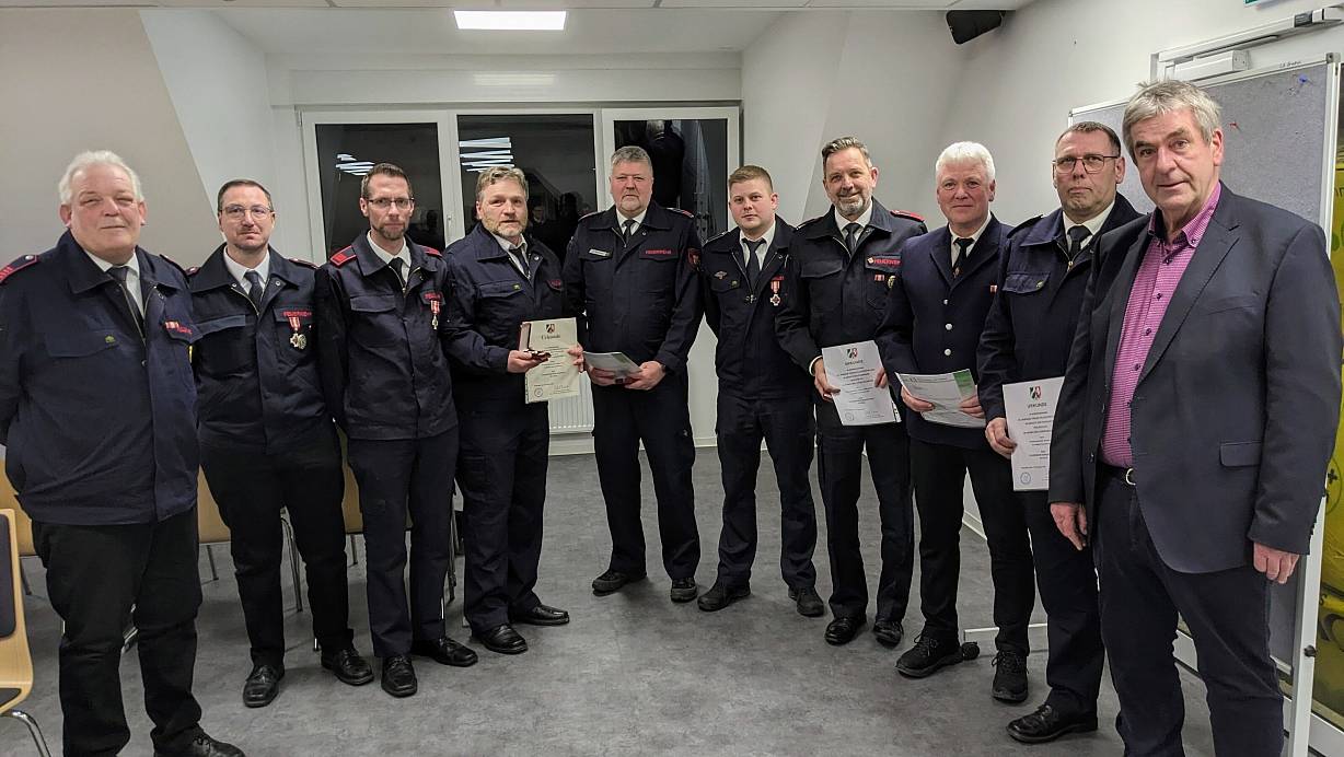 Bürgermeister Hermann Temme (r.) mit den verabschiedeten und neuverpflichteten Führungsleuten. | © Burkhard Battran