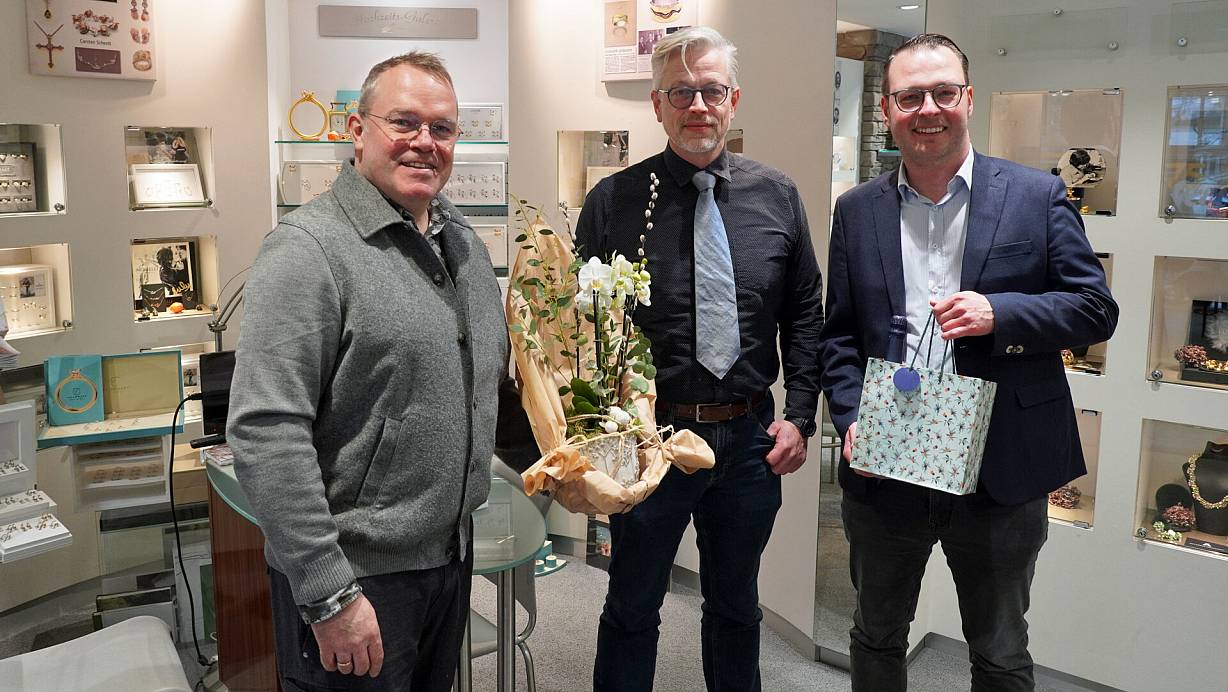 Gratulieren Geschäftsinhaber Carsten Scheidt (Mitte) zum 175. Jubiläum: Bernhard Fischer vom Werberingvorstand (links) und Bürgermeister Alexander Kleinschmidt (rechts). | © Stadt Brakel