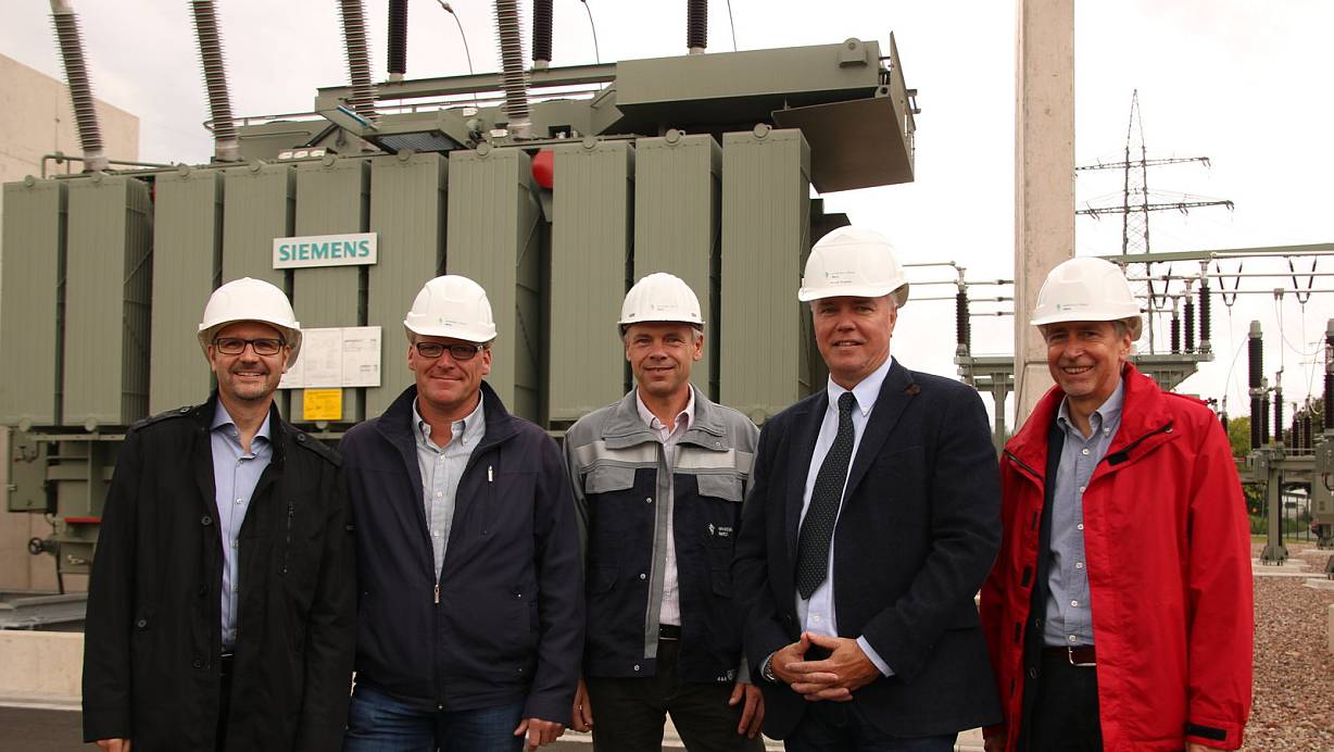Vor dem neuen Transformator: Marcus Hustadt (v. l.), Regionalbereichsleiter Höxter-Holzminden, Frank Rathert, Projektleiter, Stefan Radau, Betriebsstelle Höxter, Ruud Koops, Leiter Primärtechnik Strom, und Edgar Schroeren, Pressesprecher. | © Patricia Speith