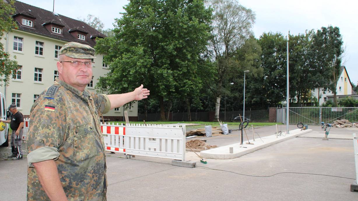 Ursprünglich hätte die Kaserneneinfahrt zum Juli verlegt werden sollen. Da aber externe Firmen mit den Arbeiten beauftragt sind und Ferien- und Urlaubszeit ist, hätten sich die Bauarbeiten verzögert. Auch der zuletzt anvisierte Termin zum August kann nicht eingehalten werden. Geplant sei nun, im September die neue Wache in Betrieb zu nehmen, sagt Mielzarek.