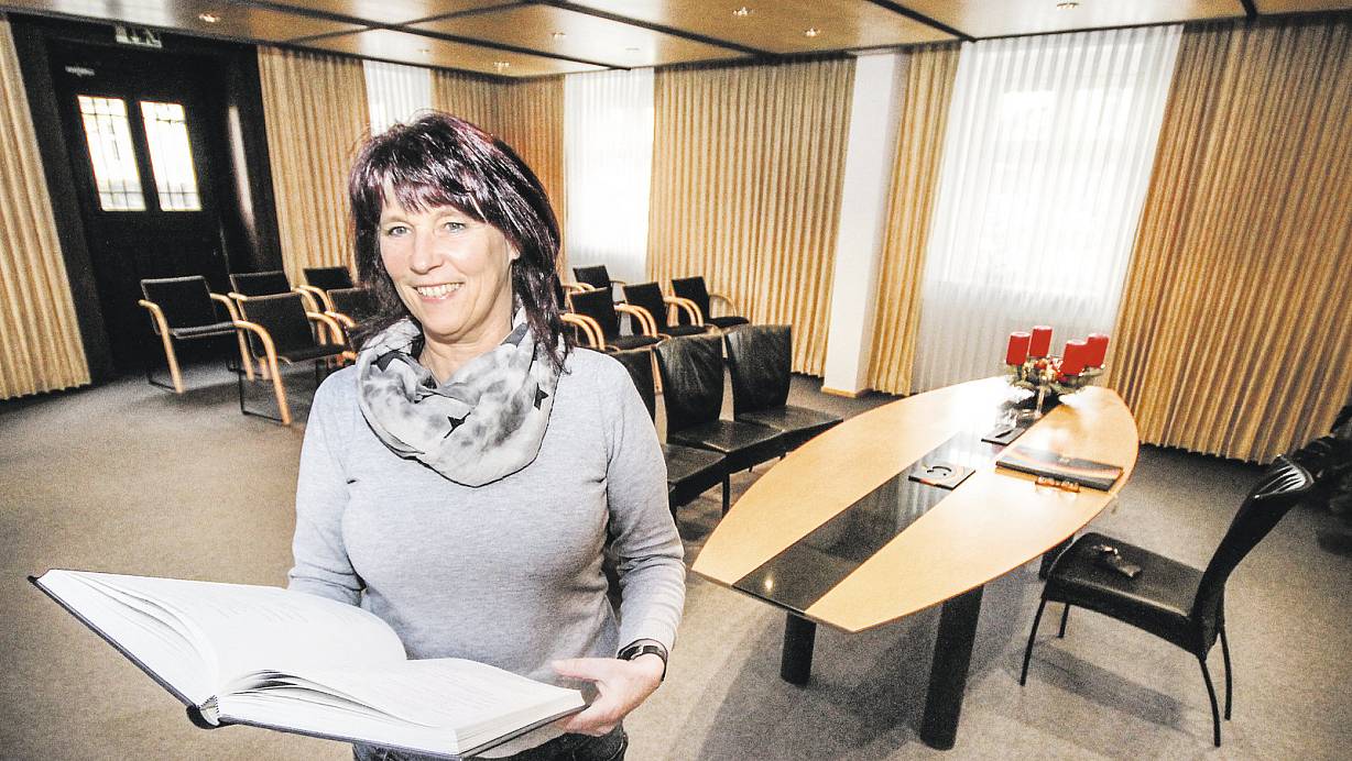 Alle in einem Buch: Lydia Drüke, Sachgebietsleiterin des Standesamtes in Höxter, mit dem Geburtsregister, in dem alle Geburten in der Kreisstadt notiert sind. Im Trauzimmer des Standesamtes wurden die meisten der insgesamt 123 Trauungen des vergangenen Jahres vollzogen. | © David Schellenberg
