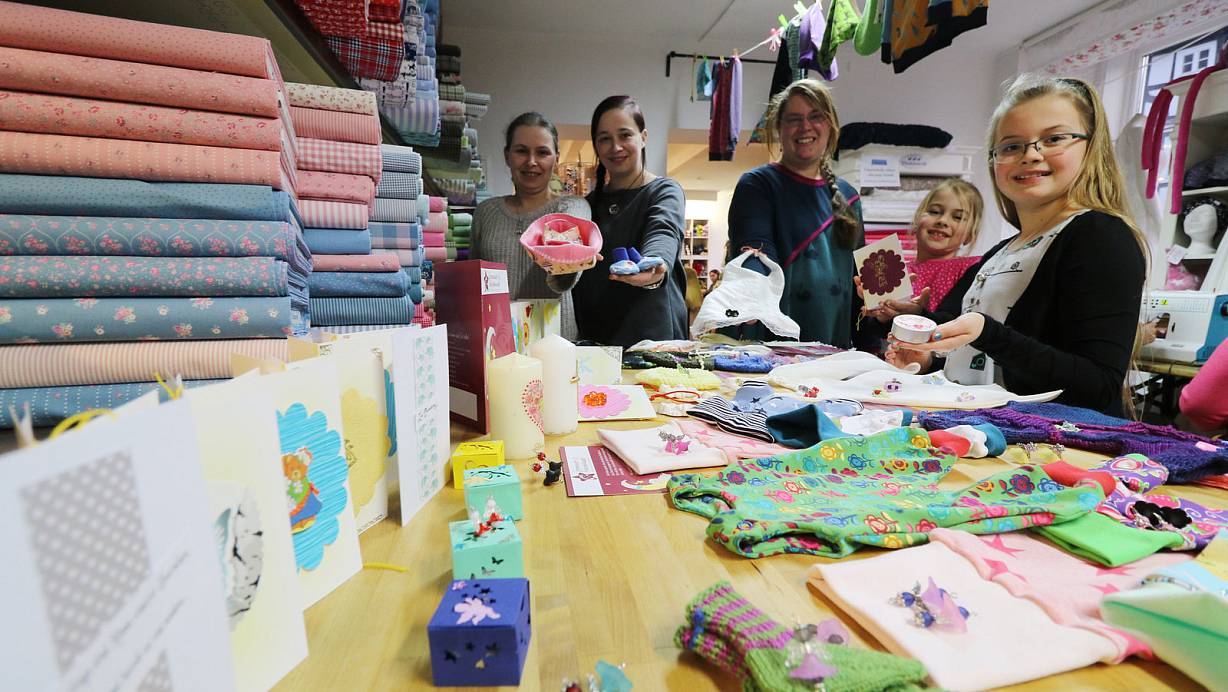 Viel geschafft – und noch viel zu tun: Nadine Boger (v. l.), Mareike Neuhaus, Alexandra Müller und deren Töchter Joanne (8) und Aimée (10) präsentieren Kleidung, Gestricktes, Andenken wie Perlenanhänger, Karten oder Kerzen und Taufaufleger für Frühchen oder Babys, die während der Schwangerschaft sterben. | © Simone Flörke