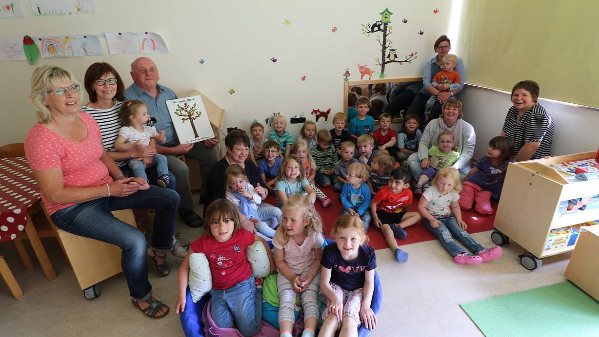 Feiern runden Geburtstag: Die Mädchen und Jungen der Kita St. Anna Fürstenau zusammen mit Christel Weller (Erwachsene, v. l.), Ursula Stickel, August Potthast, Annette Marschalt, Michaela Mundhenk, Nicole Peters und Anja Holletzek. Dazu gehören auch noch Bettina Wolff sowie Praktikantin Sarah Husemann. | © Simone Flörke