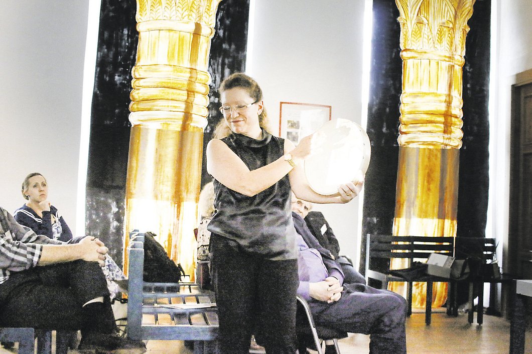 Bambus- und Keramikflöten, Klappern, Sistren, Rahmentrommeln sowie ein Original Replikat einer Tänzerinnenlaute vor und gab Einblicke in die musikalische Welt des Alten Ägyptens. | © Patricia Speith
