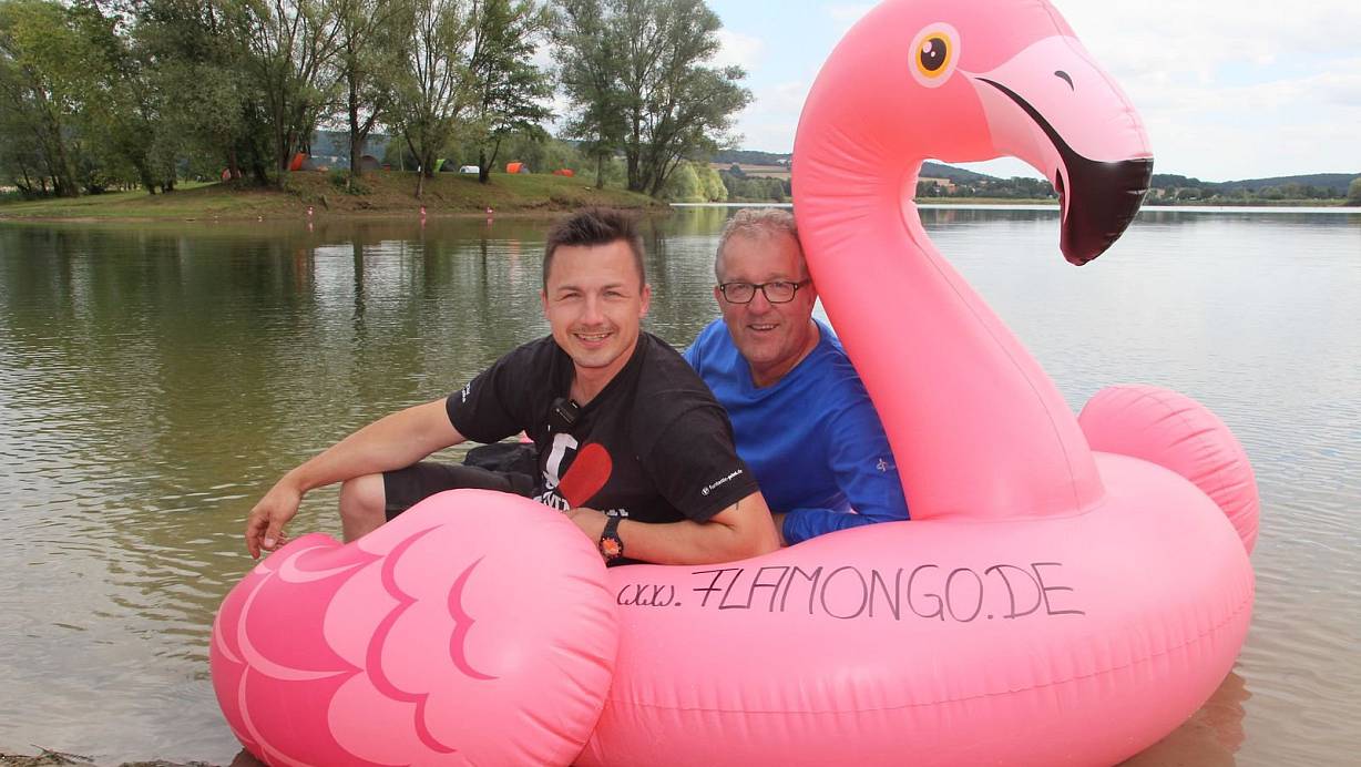Der Flamongo ist das Maskottchen der Strandklänge, die Nils Grewe (l.) und Jürgen Jäger-Stein veranstalten. | © Amina Vieth
