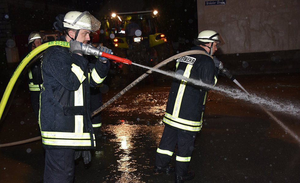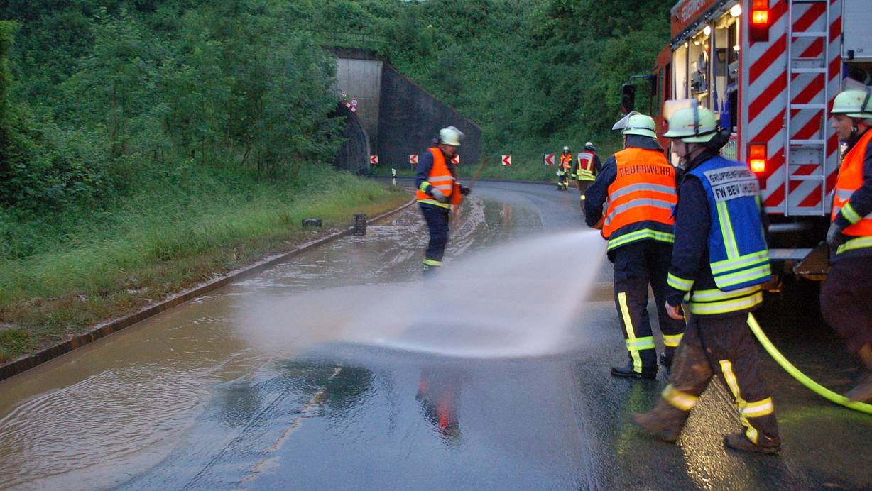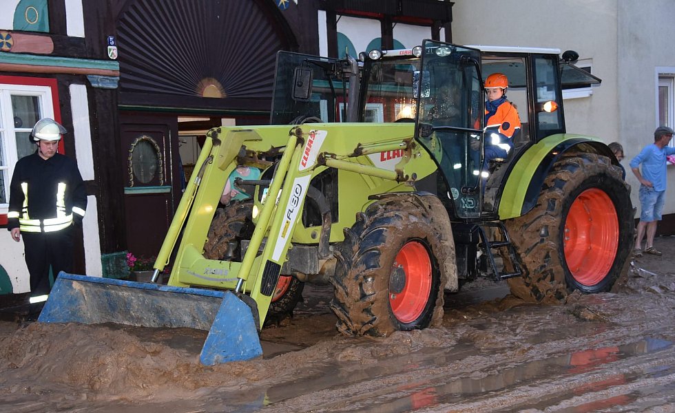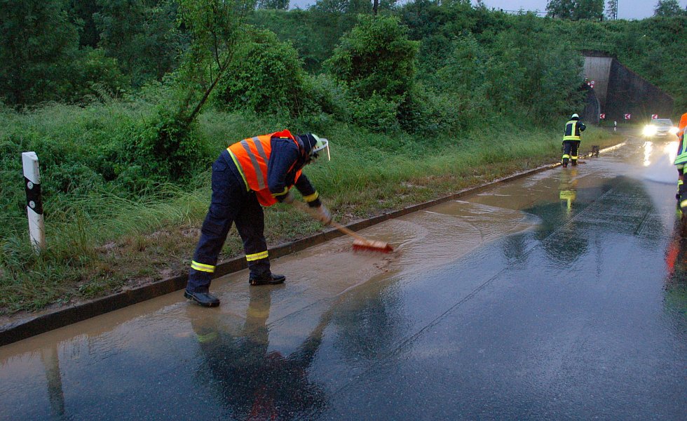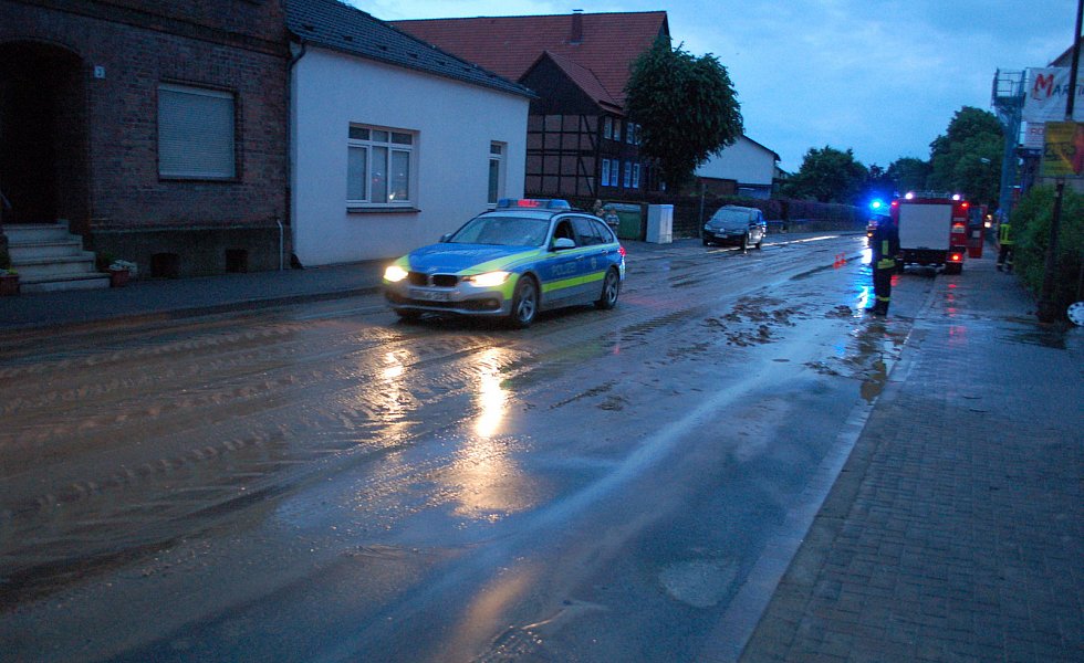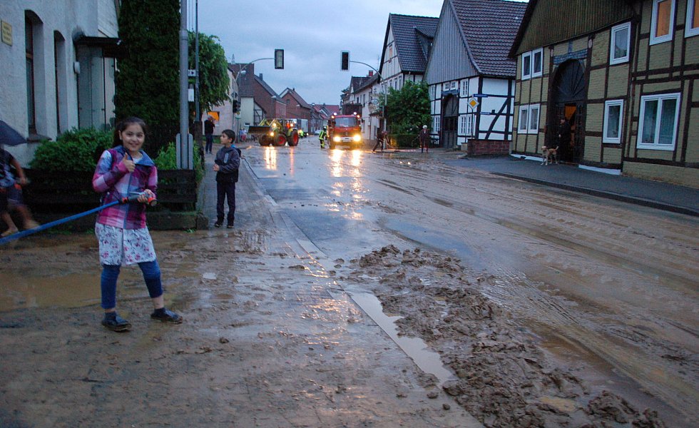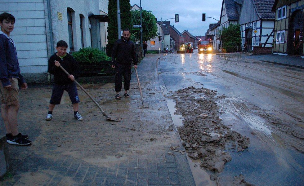 Der heftige Starkregen hatte die Bahnhofstraße binnen weniger Minuten in einen reißenden Fluss verwandelt, berichteten Anwohner. Vor allem der Schlamm, der von den Hängen in das Dorf gespült wurde, machte den Einsatzkräften der Feuerwehren zu schaffen. Bis tief in die Nacht waren Feuerwehrleute damit beschäftigt, die Fahrbahn zu reinigen. Auch viele Anwohner halfen mit.