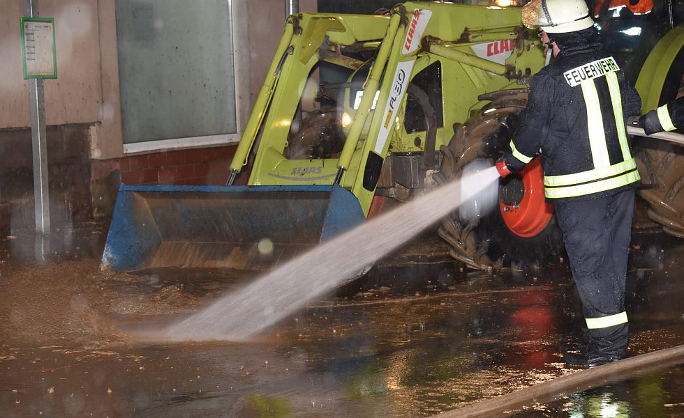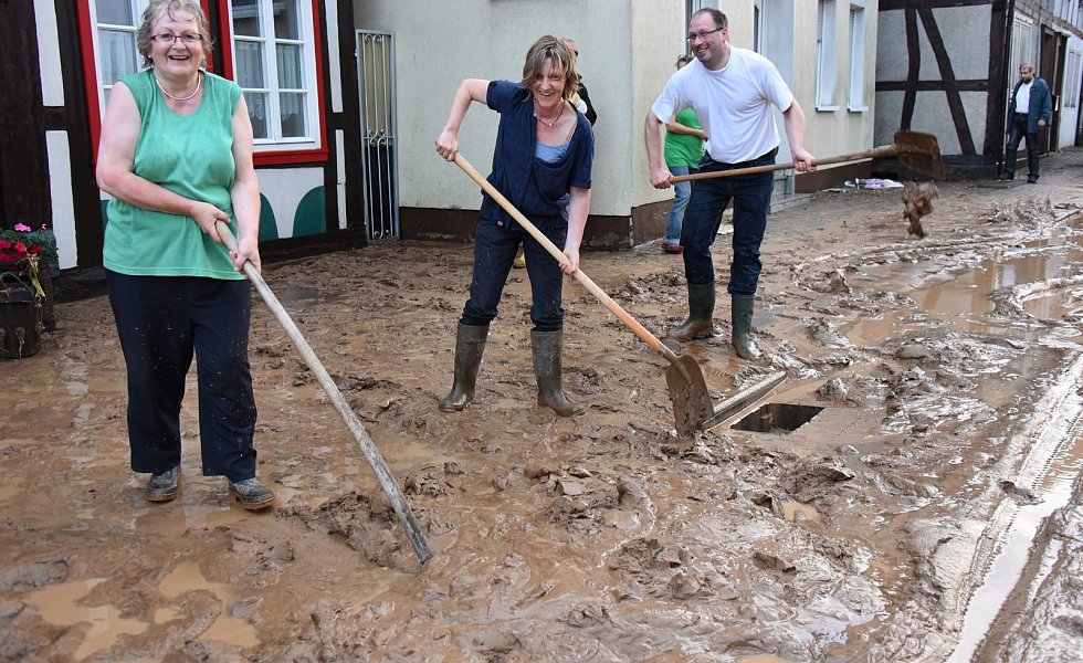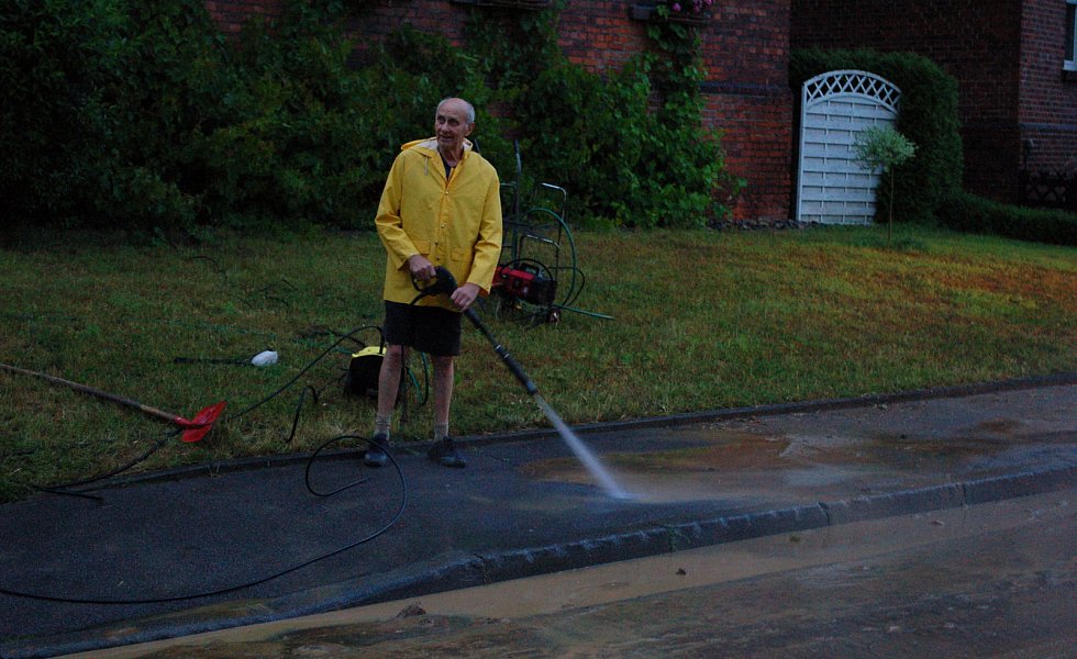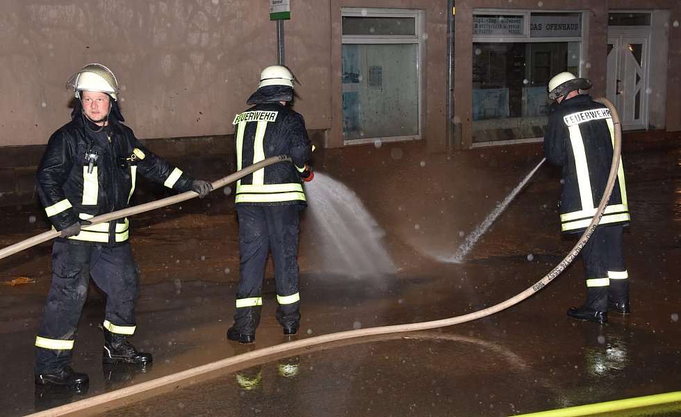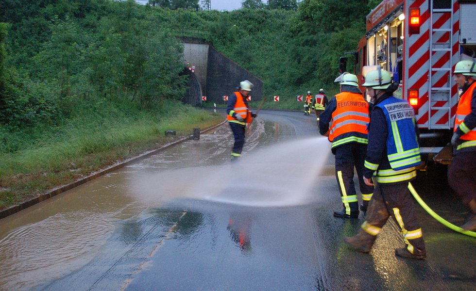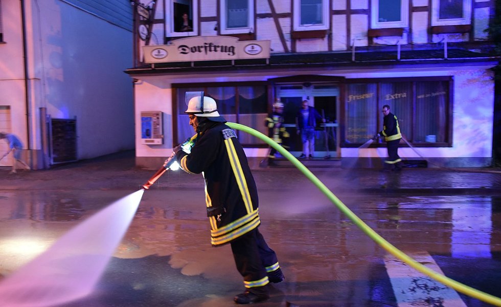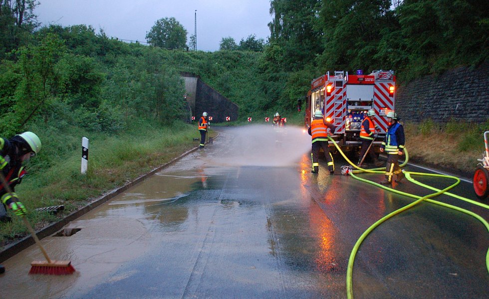 Der heftige Starkregen hatte die Bahnhofstraße binnen weniger Minuten in einen reißenden Fluss verwandelt, berichteten Anwohner. Vor allem der Schlamm, der von den Hängen in das Dorf gespült wurde, machte den Einsatzkräften der Feuerwehren zu schaffen. Bis tief in die Nacht waren Feuerwehrleute damit beschäftigt, die Fahrbahn zu reinigen. Auch viele Anwohner halfen mit.