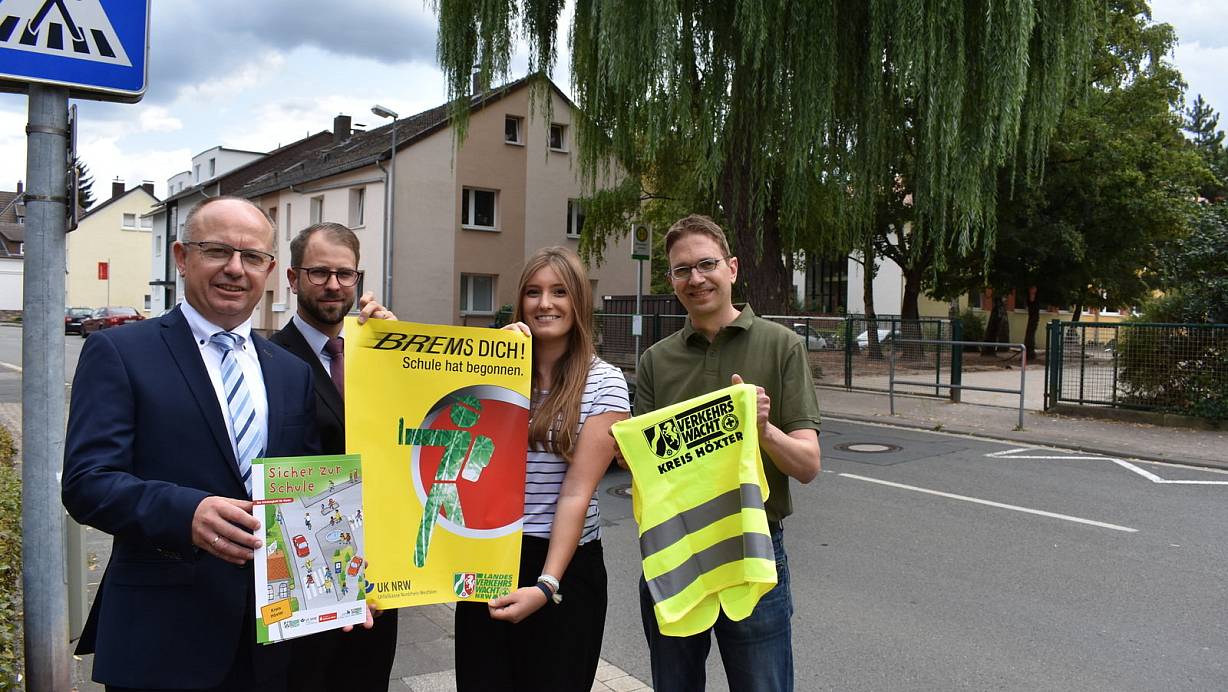 Setzen sich für einen sicheren Weg für Kinder ein: Martin Dirkes (v. l.) und Nils Dorn (beide Sparkasse Höxter), Janina Thiele (GWH) sowie Oliver Thöne von der Verkehrswacht vor der Nicolaischule in Höxter, wo – wie in vielen anderen Ortschaften – am Donnerstag die Erstklässler eingeschult werden. | © Svenja Ludwig