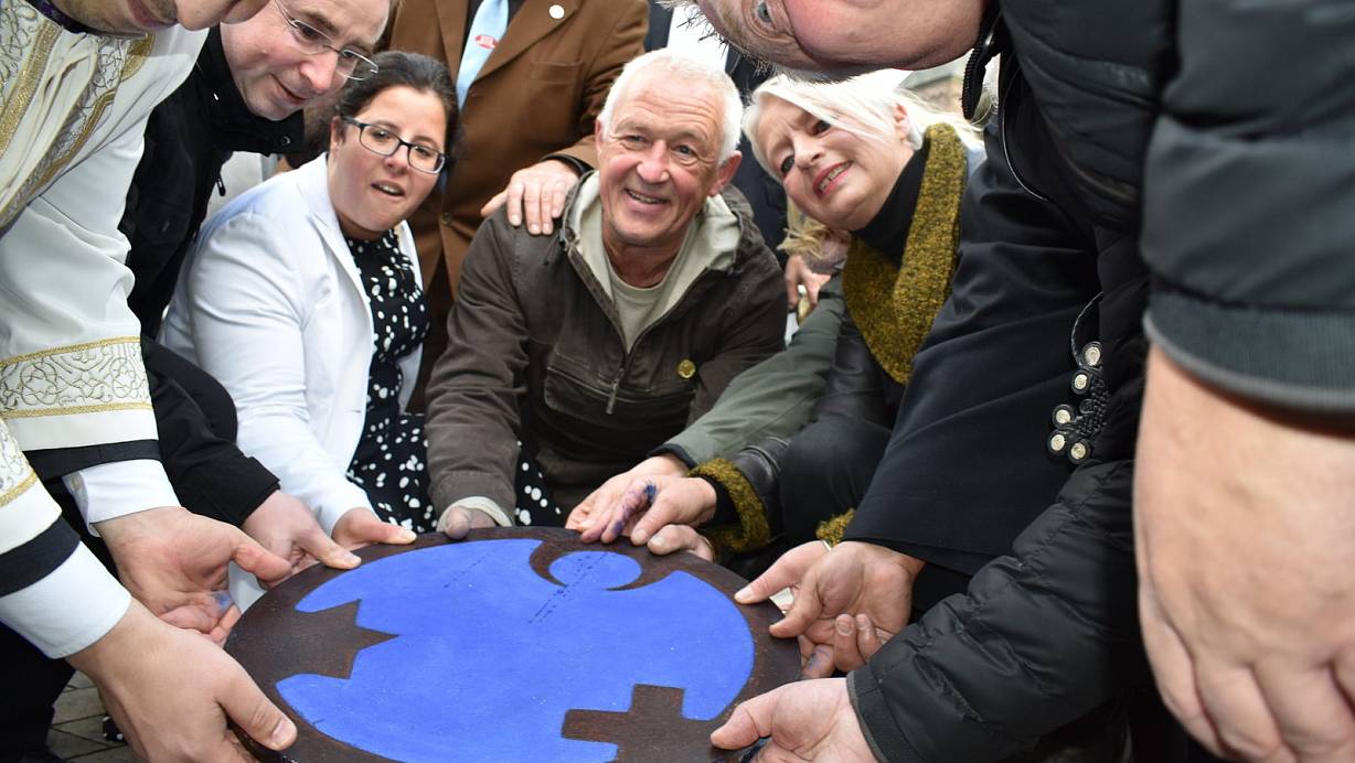 Die Bodenintarsie wird eingesetzt: Der Ring wurde bei der vorangegangenen Aktion in Lüdinghausen gefertigt. Die Symbole von Christen- und Judentum sowie Islam formen den Engel. | © Svenja Ludwig