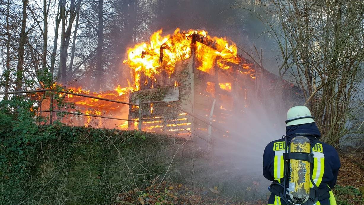 Gebäude mit einer Fläche von 20 mal 20 Metern brennt lichterloh und ist in sich zusammengefallen. 60 Einsatzkräfte kämpfen gegen Flammen