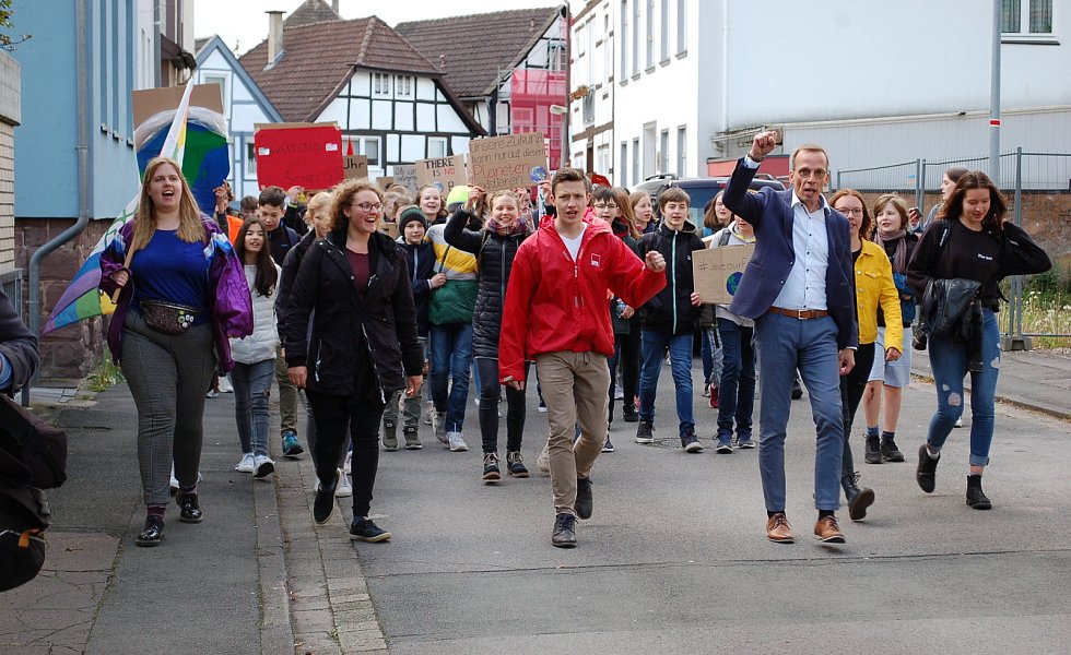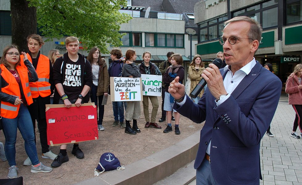 Fischer begrüßte die jungen Demonstranten auf dem Marktplatz. "Ich finde es toll, dass Ihr für das Klima auf die Straße geht", sagte der Bürgermeister. "Es ist Euer Privileg, Regeln zu brechen, um Aufmerksamkeit zu erlangen", hielt er den Schulstreik für legitim. Auch er habe als Schüler demonstriert "gegen Atomkraftwerke und Mittelstreckenraketen. Auch während der Schulzeit", bekannte er.