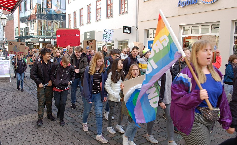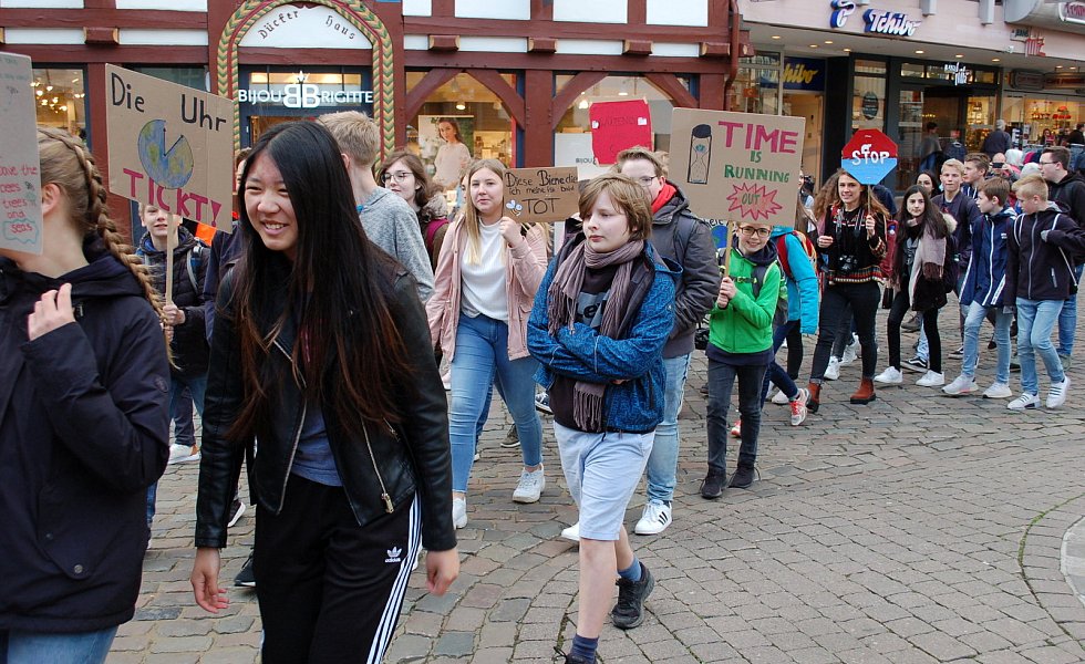 Höxter. Rund 100 Schülerinnen und Schüler beteiligten sich am Freitagvormittag an der ersten Fridays-for-Future-Demonstration in Höxter. Statt im Klassenzimmer zu sitzen, gingen sie auf die Straße und zogen lautstark mit Sprüchen wie "Hopp, hopp, hopp - Kohle stopp", "Wir sind hier, wir sind laut - weil Ihr uns die Zukunft klaut" oder "Keine Toleranz für Klima-Ignoranz" vom Marktplatz aus durch die Höxteraner Altstadt.