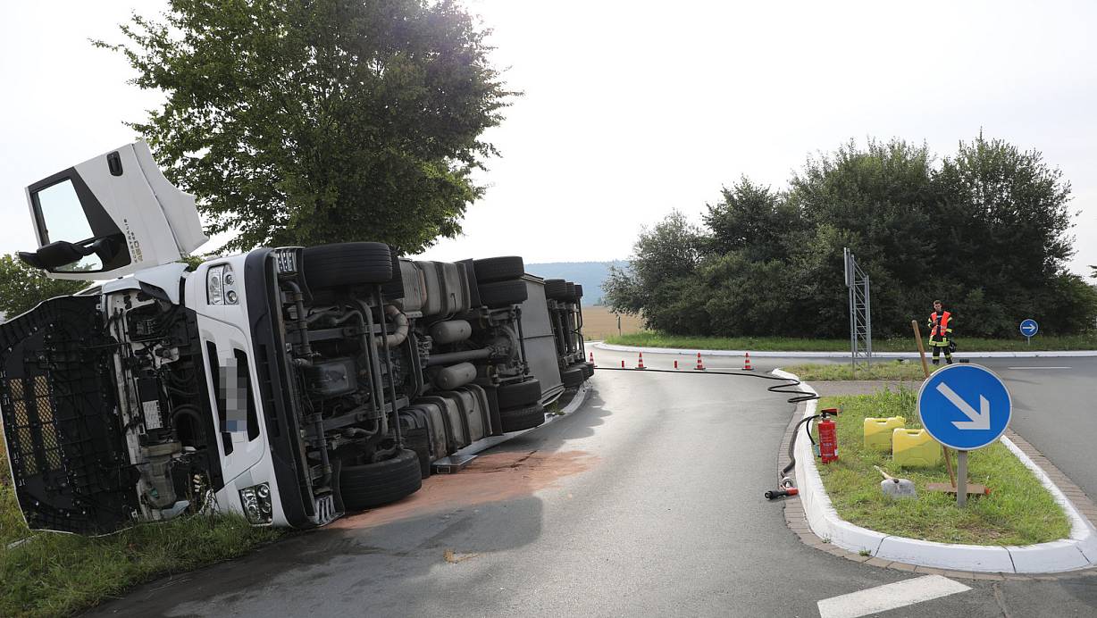 Sattelzug kippt im Kreisel der B 239 bei Brenkhausen um