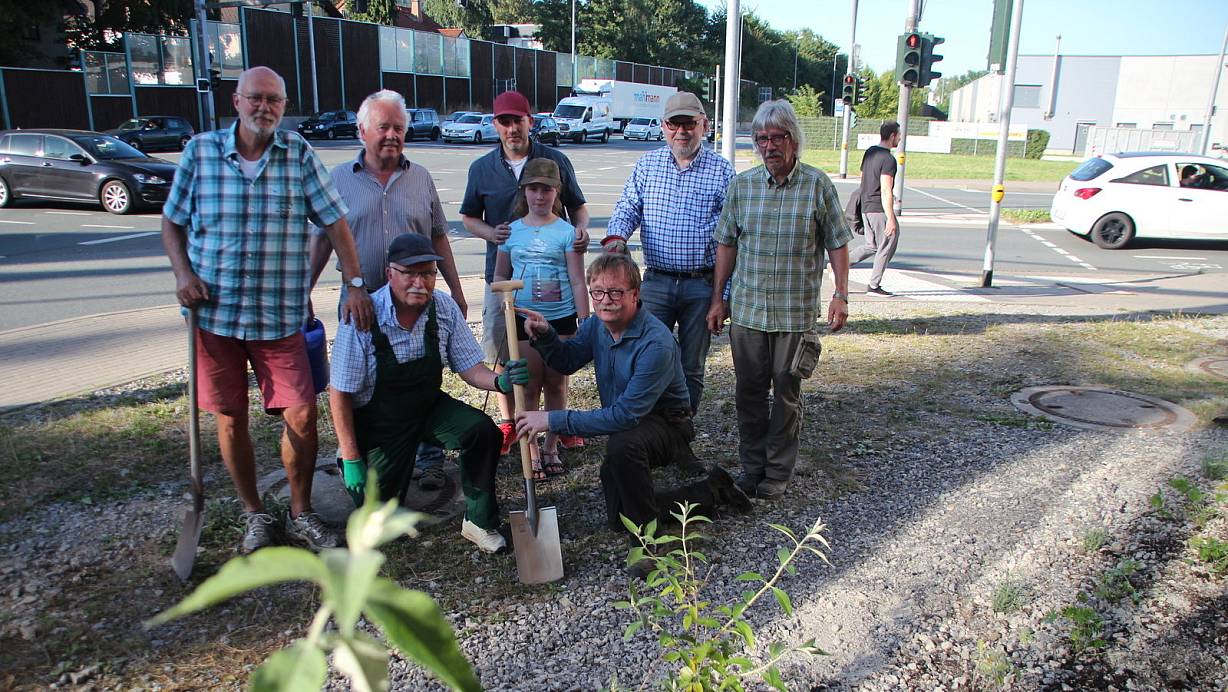 Erste Runde in der Gartenstaffel: Die Projektteilnehmer des HVV mit Roland Hesse (v. l.), Dieter Siebeck, Jürgen Lessing, Stephan Berg mit Tochter Angelie, Vorsitzender Norbert Drews, Stadtheimatpfleger Wilfried Henze und Stadtgärtner Ralf Haffke. | © Burkhard Battran