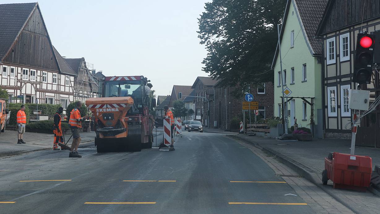 Die Sanierung der Bundesstraßen-Kreuzung in Godelheim geht voran. Am Donnerstagmorgen wurde eine Fahrbahnseite asphaltiert. | © Simone Flörke