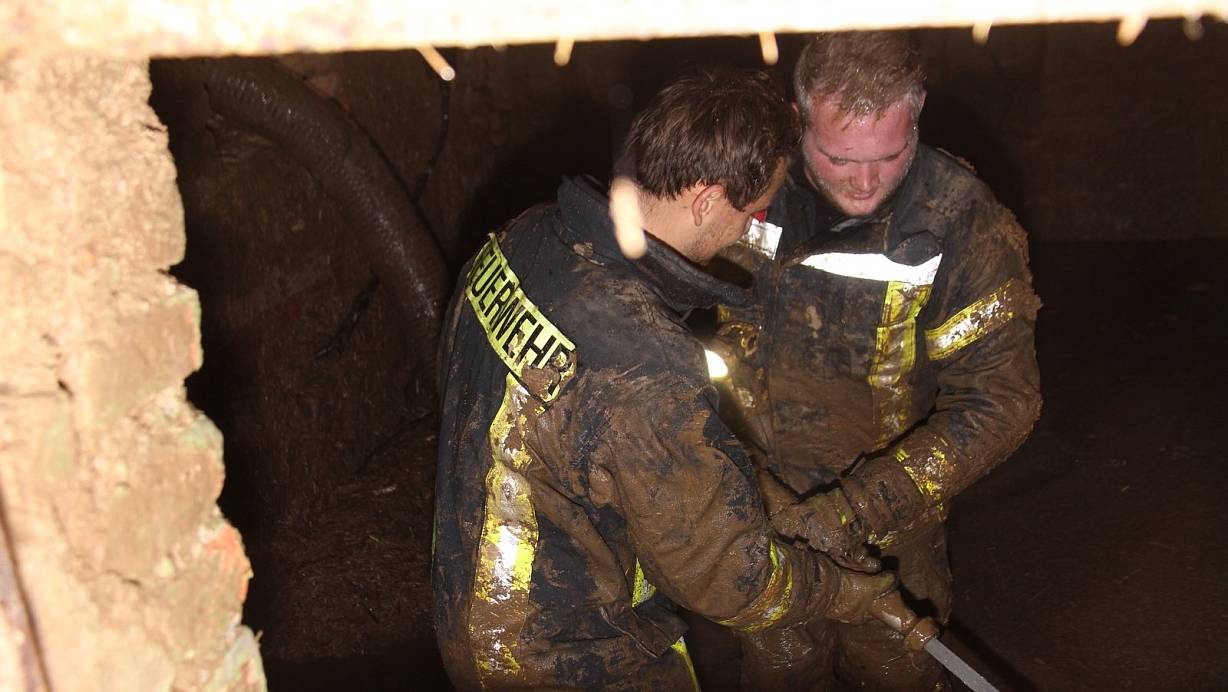 Die Einsatzkleidung von Johannes Rehrmann und Albert Fischer von der Feuerwehr Erkeln war völlig verschlammt, als ein Starkregen im Oktober Unmengen Schlamm in das Dorf Erkeln spülte. | © David Schellenberg