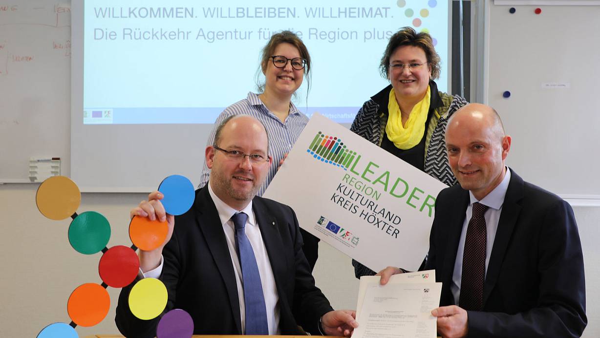 Michael Stolte (Geschäftsführer Gesellschaft für Wirtschaftsförderung; v. l.) Julia Handtke, Christiane Sasse (Leader im Kreis Höxter) und Jens Kronsbein von der Bezirksregierung. | © Simone Flörke