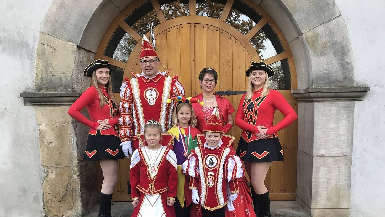 Peckelsheim: Prinz Wolfgang II. Janzen und Prinzessin Christiane I. Janzen (hinten, Mitte) regieren bei Pickel Jauh in Peckelsheim. Hier sind sie mit den Funkenmariechen Jasmin Isenberg und Juliane Stiewe sowie dem Kinderprinzenpaar Klara I. Koch und Jonas I. Kleinschmidt-Michels sowie Kinderhofnärrin Ida I. Koch zu sehen. | © Pickel-Jauh