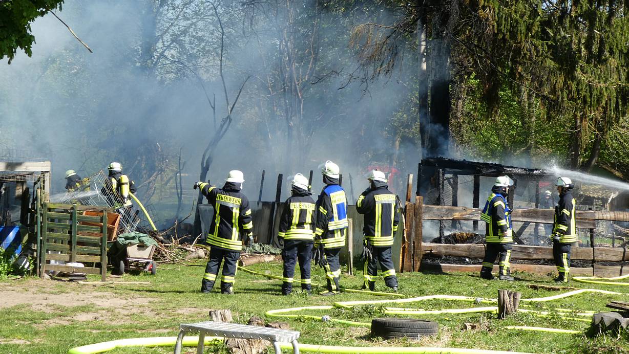 Höxter. Ein Gartenareal im Brückfeld in Höxter, auf dem mehrere Hunde und Ziegen leben, geriet am Donnerstagnachmittag in Brand. Als die Feuerwehrkräfte des Löschzuges Höxter sowie der Löschgruppen Lüchtringen, Boffzen und Fürstenberg eintrafen, standen eine Hütte und Verschläge bereits in Vollbrand.
