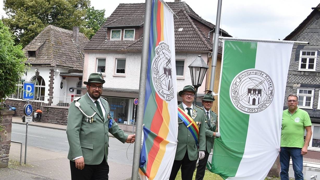 Gilde-Kommandeur Thomas Wiesemann (v. l.), Schützenkönig Frank Wiesemann, Hauptmann Alfred Micus, Gilde-Sprecher Thorsten Stein und der ehemalige Schützenkönig Andreas Hirt hatten bereits zuvor die Schützenfahne gehisst. | © Thomas Kube