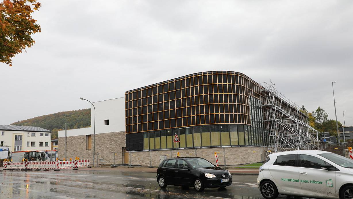 Das Gerüst an der Fassade des neuen Hallenbades steht bereits, das Holz lässt noch auf sich warten. Derweil finden entlang der Lütmarser Straße Arbeiten statt für die Hausanschlüsse. | © Simone Flörke