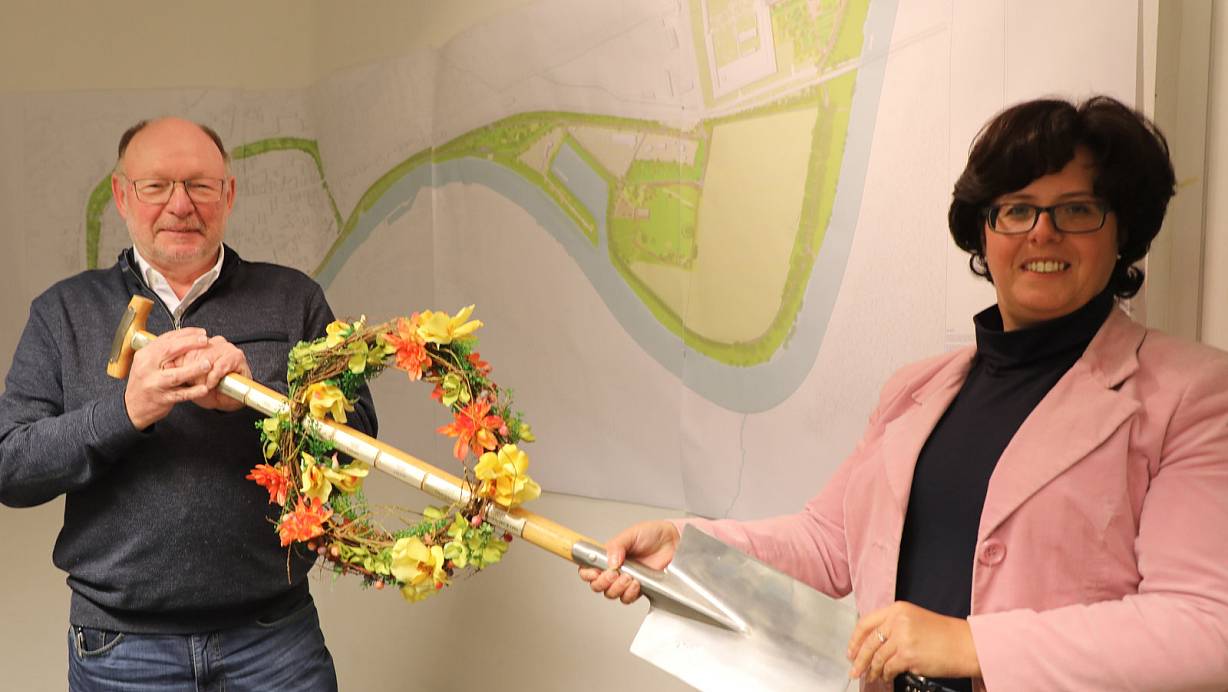 Die Geschäftsführer Heinrich Sperling und Claudia Koch mit dem LGS-Spaten, auf dem sich bereits Landesgartenschauen seit 1984 mit je einer Plakette verewigt haben. | © Simone Flörke