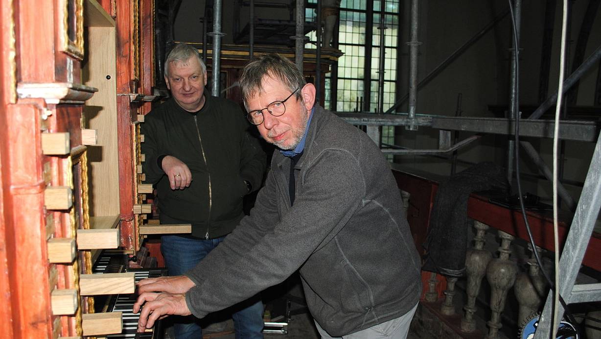 Dick Koomans und Jan Spijker (r.) waren nach der ersten Klangprobe begeistert. Die restaurierte Springladenorgel wird in den nächsten Monaten intoniert. | © Kirchengemeinde Corvey
