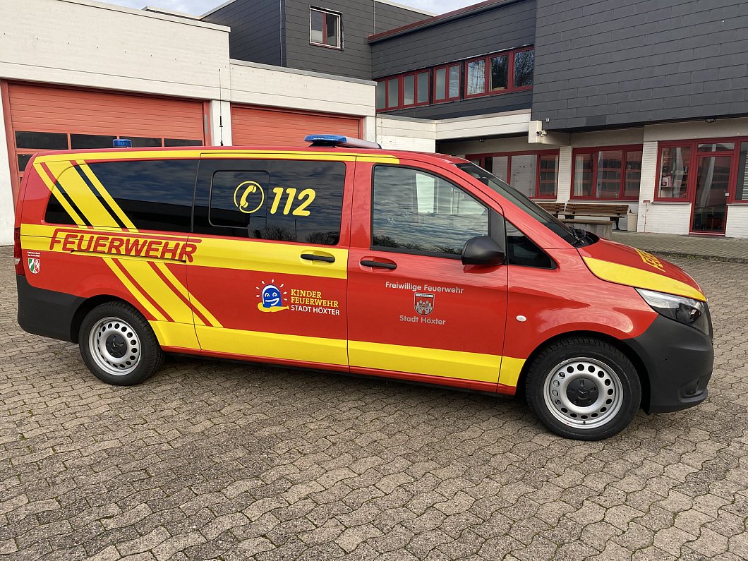 Für die Kinderfeuerwehr wurde aufgrund einer Förderung des Landes NRW ein nagelneues Mannschaftstransportfahrzeug beschafft. Der Leiter der Feuerwehr Höxter, Stadtbrandinspektor Jürgen Schmits, freut sich, dass die Jugendarbeit gefördert werden könne. Mit 80 Prozent Förderleistung hat sich das Land an der Beschaffung beteiligt. Nicht ausschließlich für die Kinderfeuerwehr steht das Fahrzeug zur Verfügung, sondern auch die Jugendfeuerwehr kann durch die Förderbedingungen das Fahrzeug nutzen. Neben den insgesamt neun Sitzplätzen stehen auch acht Kindersitze zur Verfügung, damit die Sicherung der Kinder möglich ist. Stadtkinderfeuerwehrwartin Karina Schönfelder freute sich mit dem Jugendfeuerwehrwart Andreas Mühlen sehr über das Fahrzeug, beide planen schon die zukünftige Verwendung.