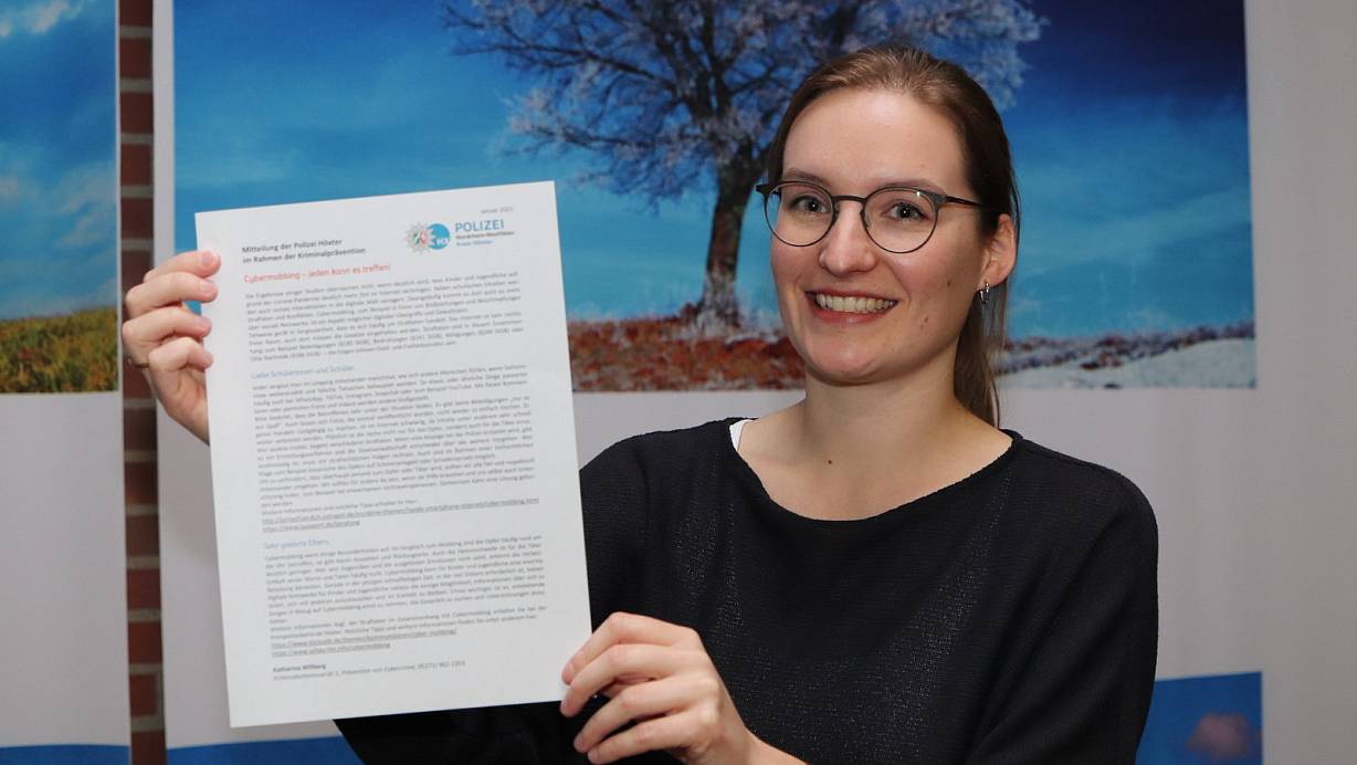 Katharina Willberg, Präventiosnberaterin der Kreispolizeibehörde Höxter zeigt den Brief an die Schüler und Eltern. | © Polizei Höxter