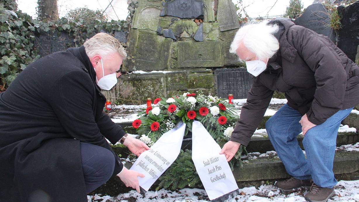 Bürgermeister Daniel Hartmann (l.) und der Vorsitzende der Jacob-Pins-Gesellschaft, Fritz Ostkämper, legen einen Kranz am Höxteraner jüdischen Friedhof nieder. | © Burkhard Battran